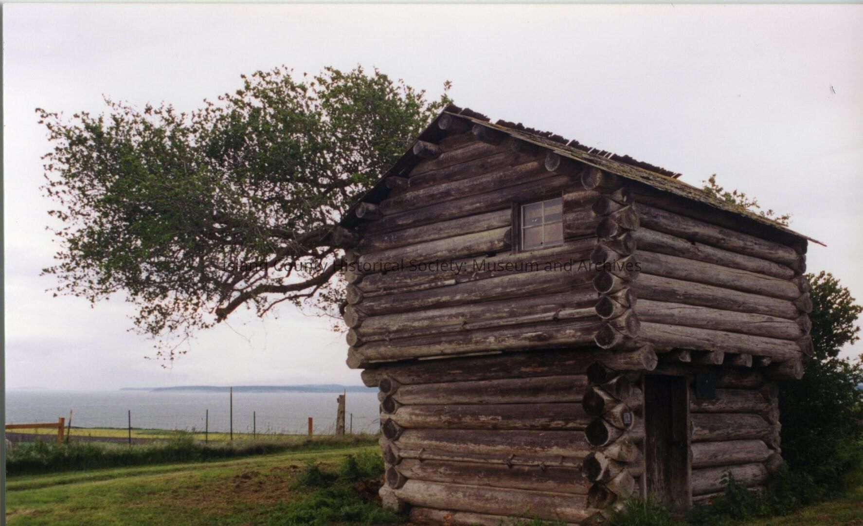 Jacob and Sarah Ebey House. Exterior partial view of loghouse across from the Ebey house. Same as 2016.133.269 except that this one is slightly turned to the left- note the rounded tuft of tree about halfway up photo on far right side. This is a tad leafier than .269. Water and prairie in background on left.
