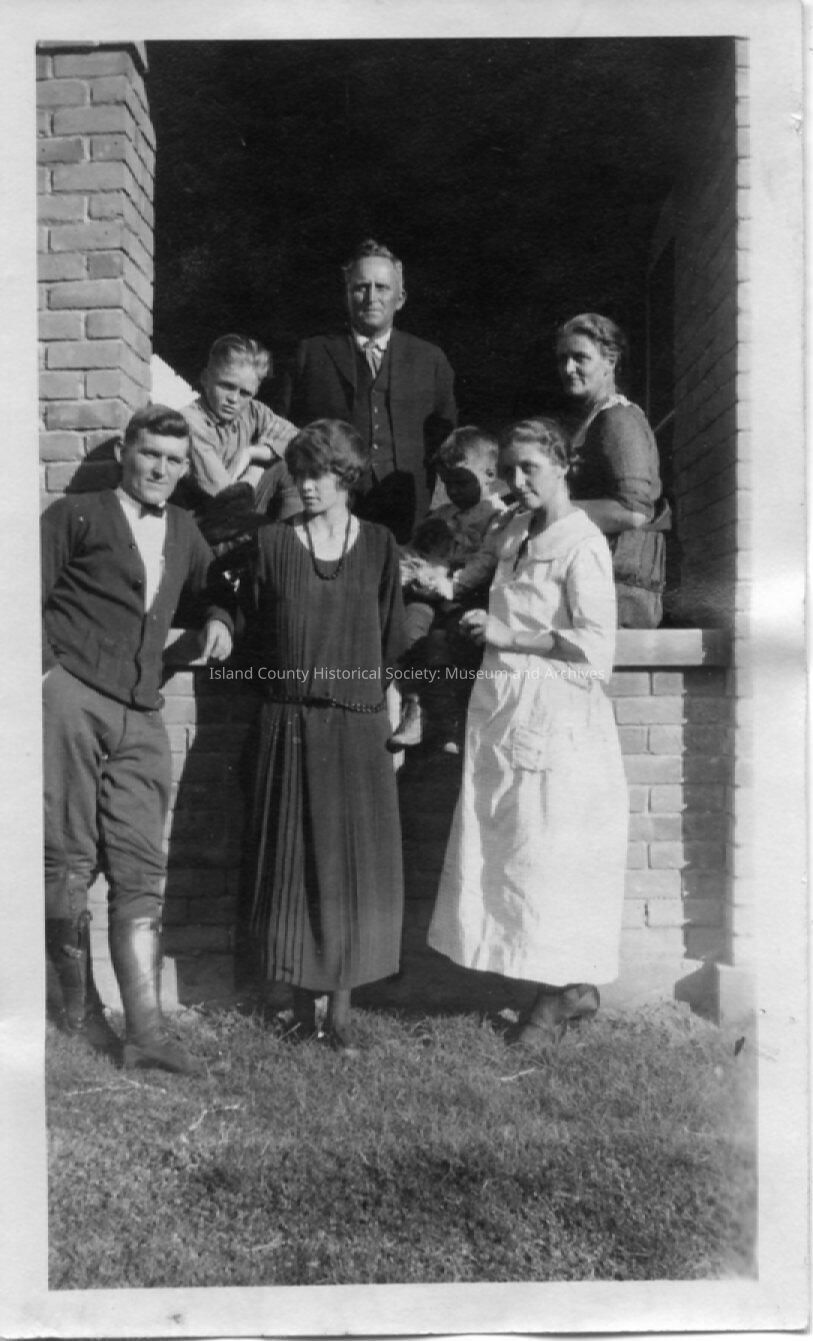From Arthur Kineth Album: seven people in front of a brick porch. On back: From left to right - George & Geo & May standing on the ground. Cyril Tom, Sam, Philip & Inez in the background on verandeh (sic). Sept 29 - 23 at Mays home. George 26 - Aug 16, May 25 - Sept 1, Geo 20 Oct 11, Philip 4 - Aug 17, Cyril T 11 - (unreadable).Made/Created
