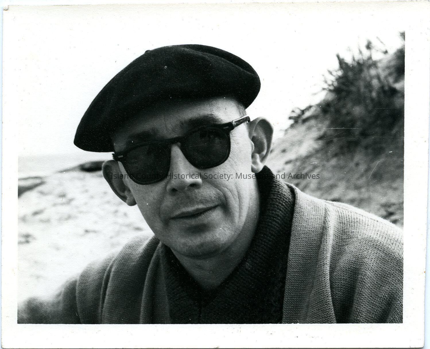 A man outside at a beach. He is wearing a sweater/cardigan, sunglasses and a beret. He has a faint mustache. On the back: Earl Cahail 1949?.