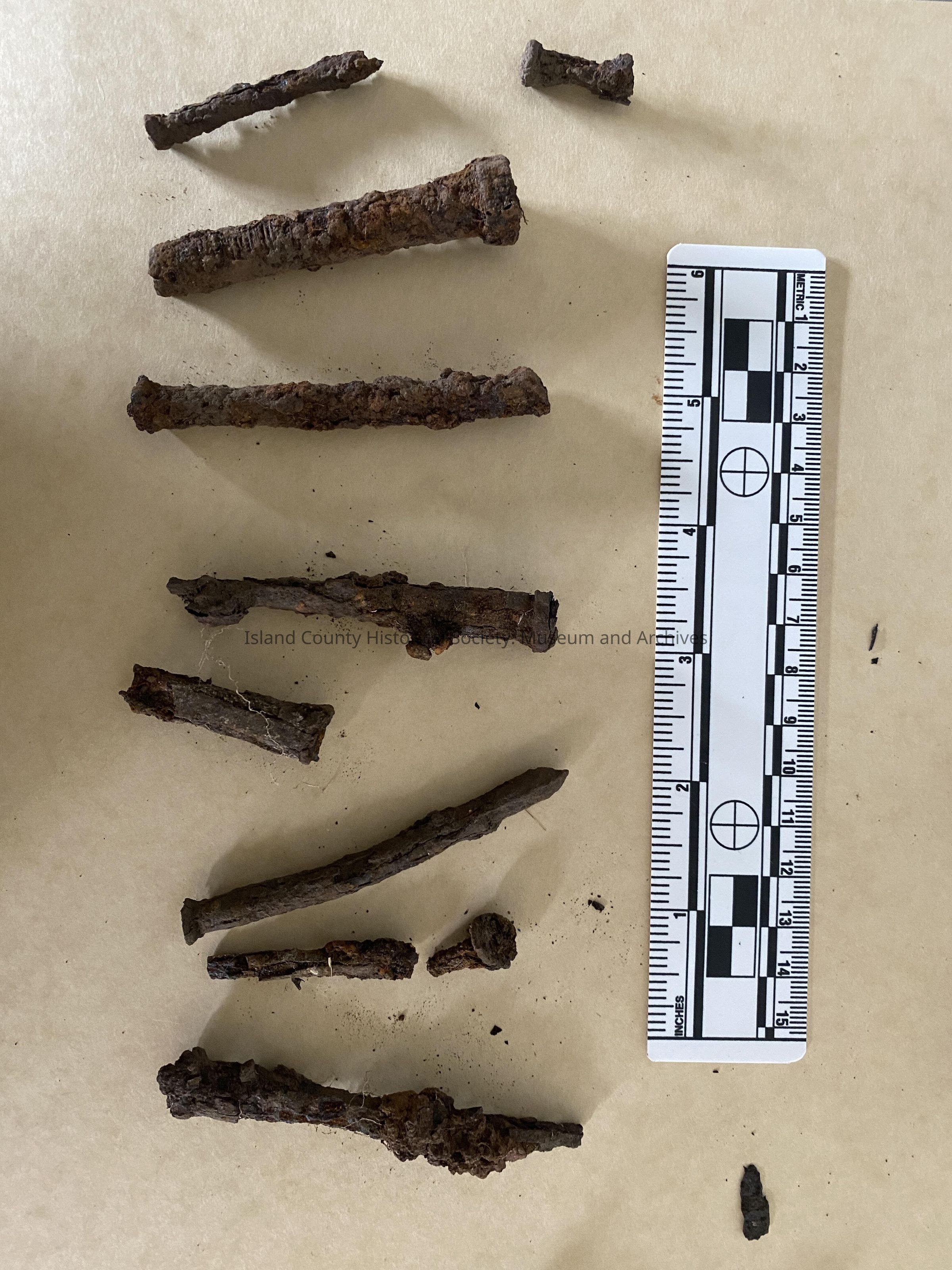 Square nails, handmade, retrieved from the Captain William Robertson Donation Land Claim by Kellan Diamanti and Deborah Fisher with permissions from Judee Lea, property owner at the time.