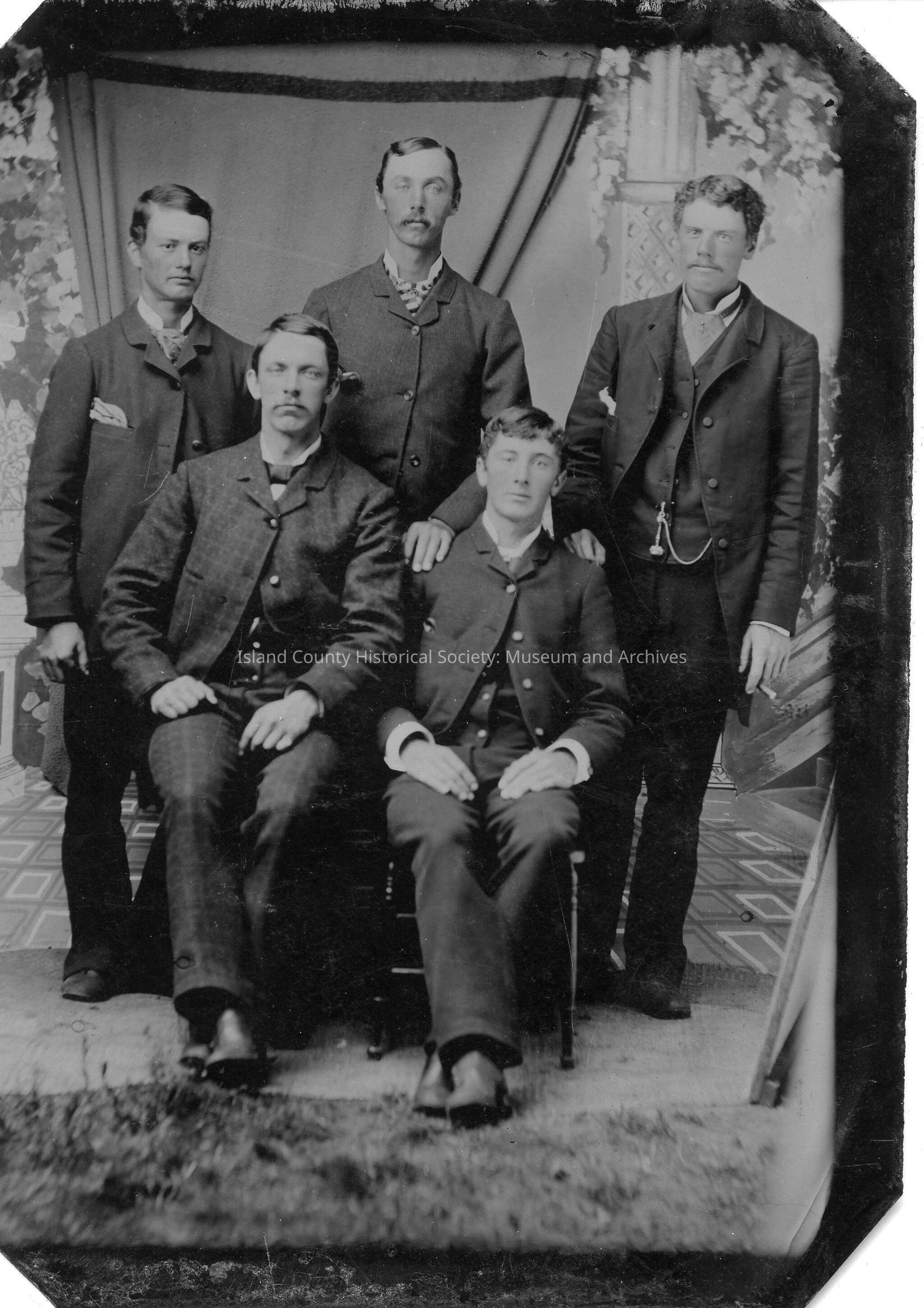 A black and white tintype photo of a five men. Two sitting in chairs. Three standing behind them. A handwritten note on the back is "Power, man standing in middle, back row, may be one of the Power's brothers, Joseph, Henry or Isaac."