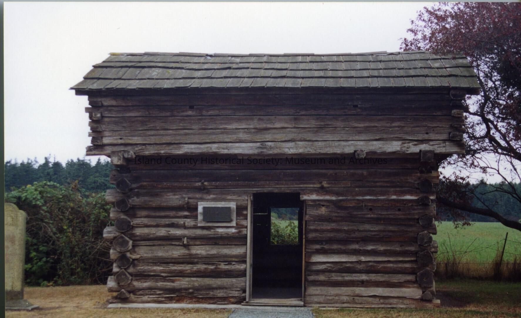 Davis blockhouse at Sunnyside Cemetery. Exterior view. Lengthside. Gravestone to the left, tree to right. Grassland and forest in background- distance away. Open doorway and window. Black plaque attached.