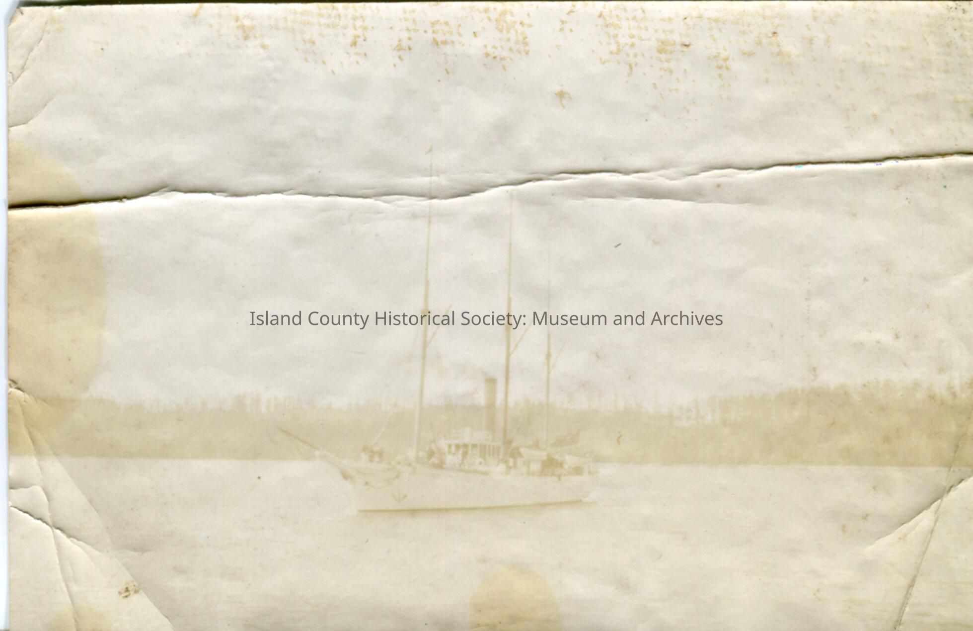 A faded photo of a large boat in the water. The boat has three masts and what looks like a steam stack. There is land covered with trees in the background.