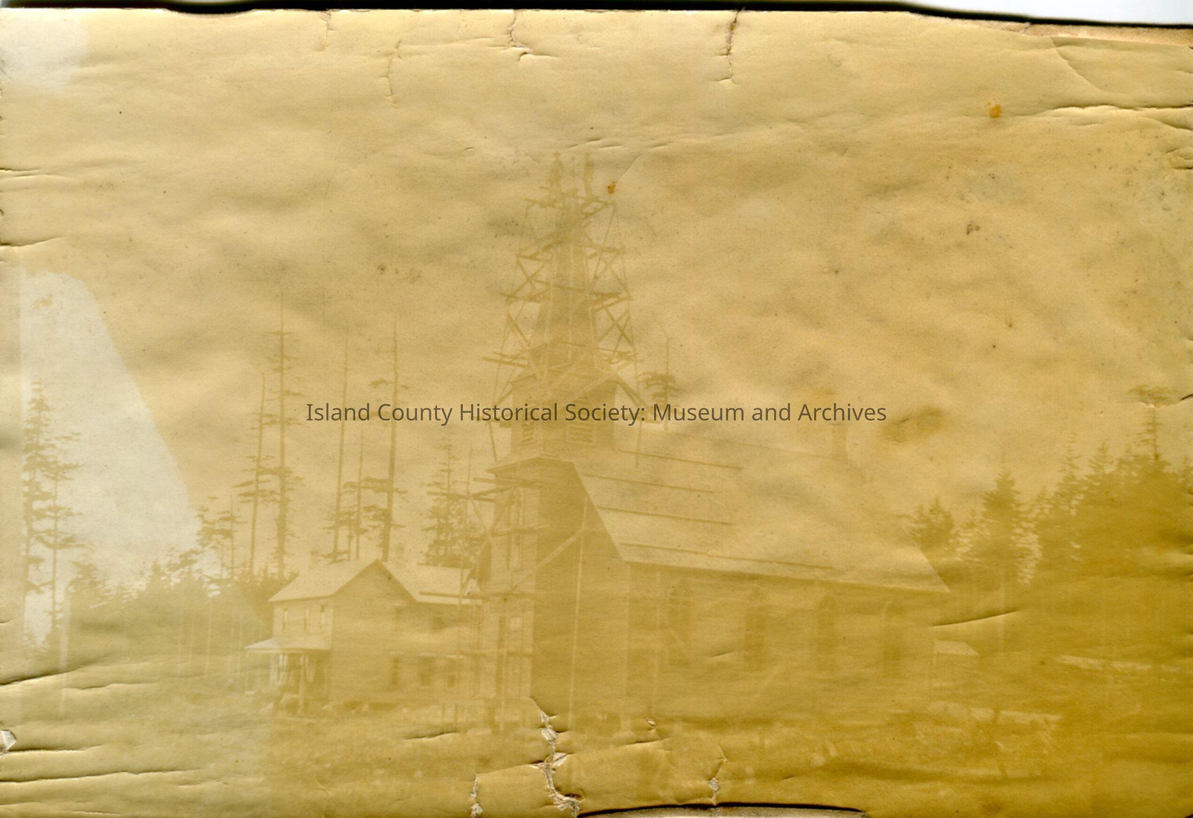 A faded photo of what looks like a church being built. There is another two-story building on the left-side of the photo. There is scaffolding around the steple of the church and two men standing on the very top of the scaffolding. There are large logs on the ground and there are many trees in the background.