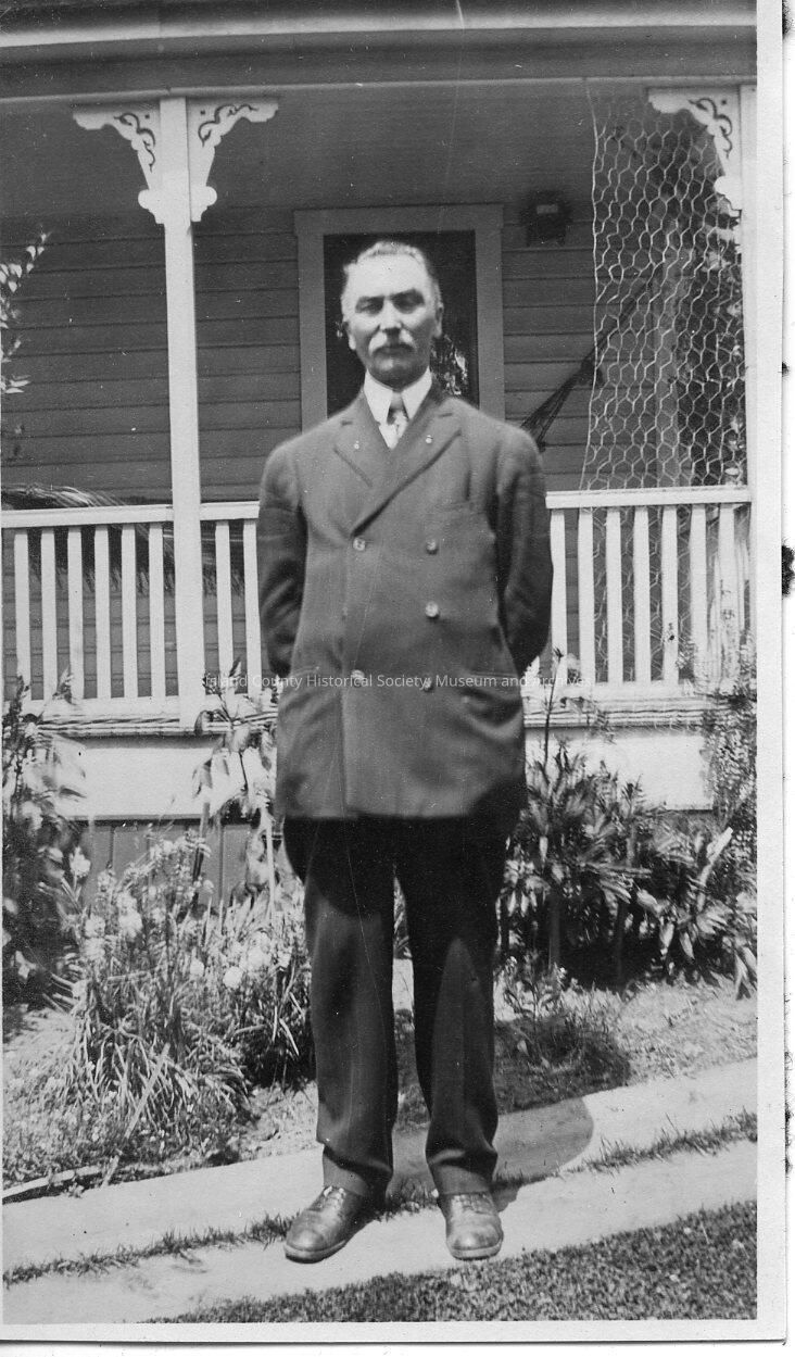 A black and white photo of a man standing outside a home. Handwritten on the back is "Isaac N." From old entry: Isaac N. Power