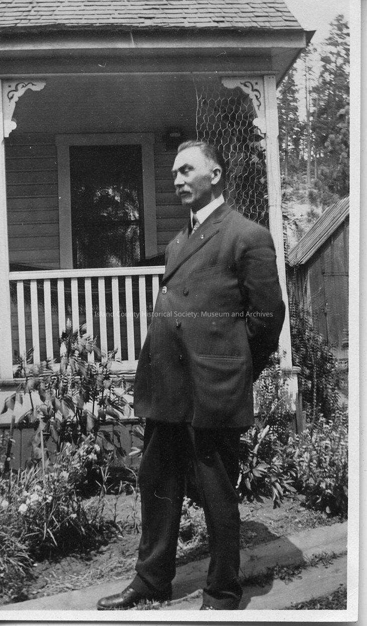 A black and white photo of a man standing outside a home, facing to the left. Handwritten on the back is "Isaac Power. Sibbie Fisher's house?"Lexicon