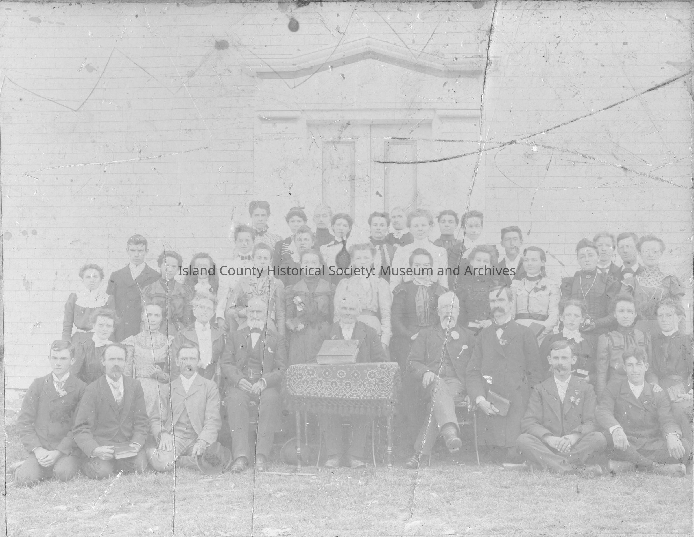 B&W photo of group of people posed in front of building, photo is very old and faded, no markings to ID