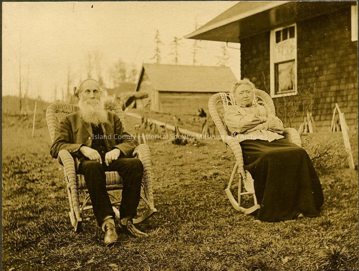 Mr. and Mrs. Sabine and Lucy Abbott Sitting in chairs at their home 5345 Morgan St., Rainier Valley, Seattle. When this picture was taken they had recently celebrated 60 years of marriage. Sabine and Lucy Abbott were married on January 2, 1859.