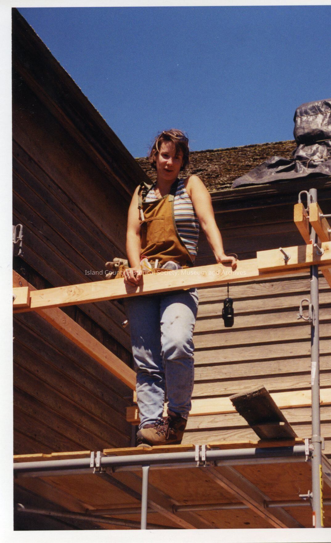 Ferry House Restoration. Exterior shot. Portrait. Woman standing on scaffolding. Short tousled brown hair, blue jeans, brown boots, sleeveless top and tool belt. Scaffolding reaches upmost floor of the house, so behind her you can see the roof. Scaffolding is placed in a corner. Sunny outside.