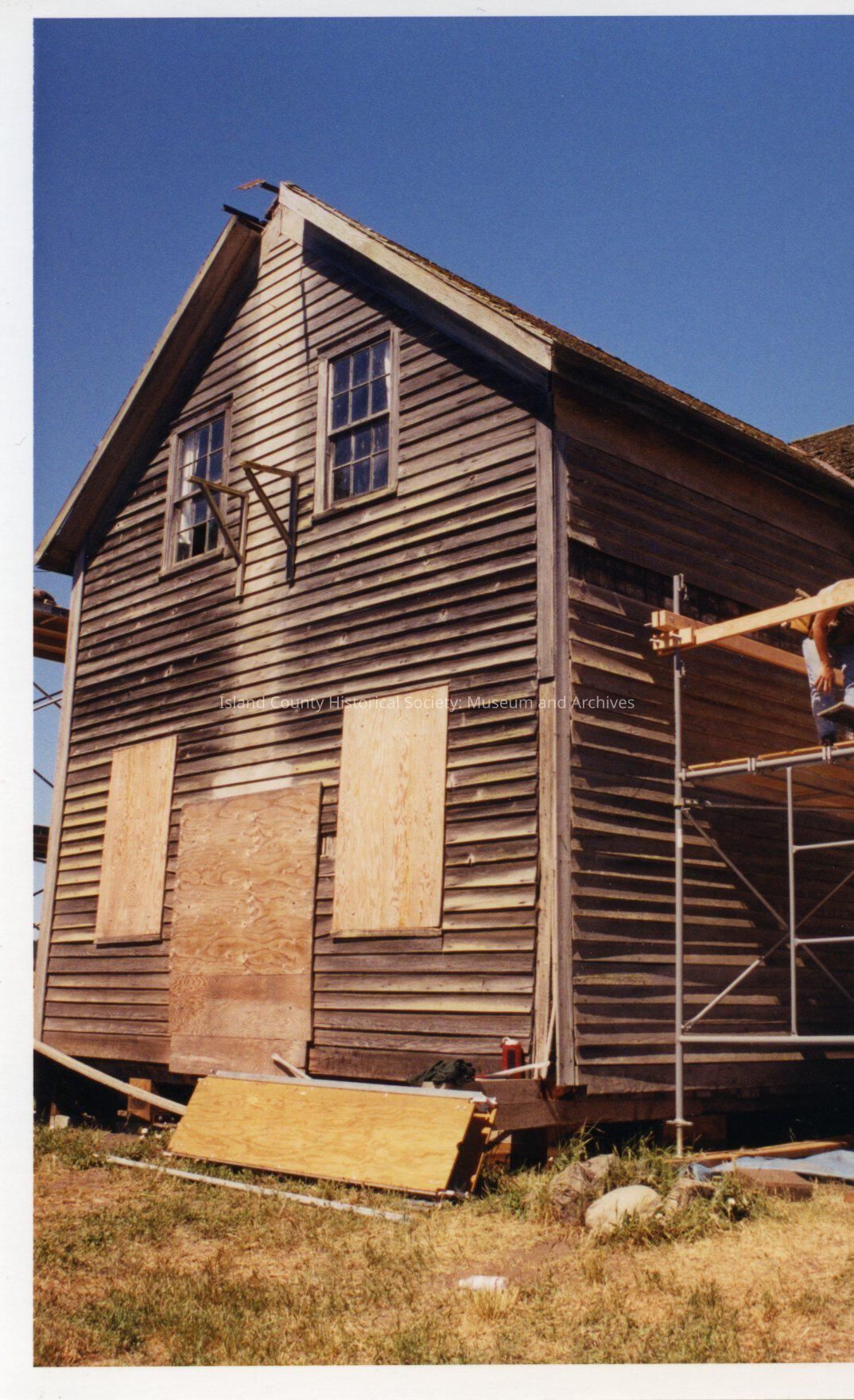 Ferry House Restoration. Exterior shot. Side of building. Lower two windows and door are boarded up. Scaffolding on either side of this section of the house. On top of scaffolding to the right of the picture is a person bending over. Possibly the same person (woman) as in 2016.133.289. Wooden boards lying on ground in front of building. Equipment lying around.