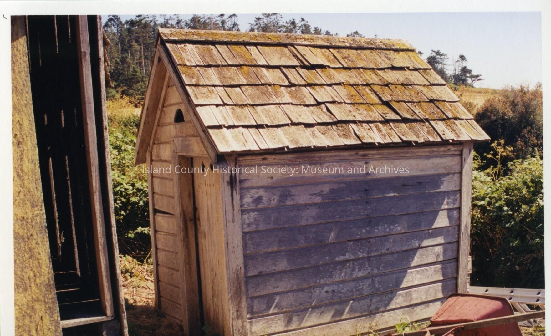 Ferry House Restoration. Exterior shot. Close-up of outhouse. Partial view of upturned wheelbarrow and ladder to the right of picture. Moss on roof. Door is slightly ajar and has two diamond cut outs at the top. Under eaves above the door is a semi-circle cut out. Glimpse of stables to the left.