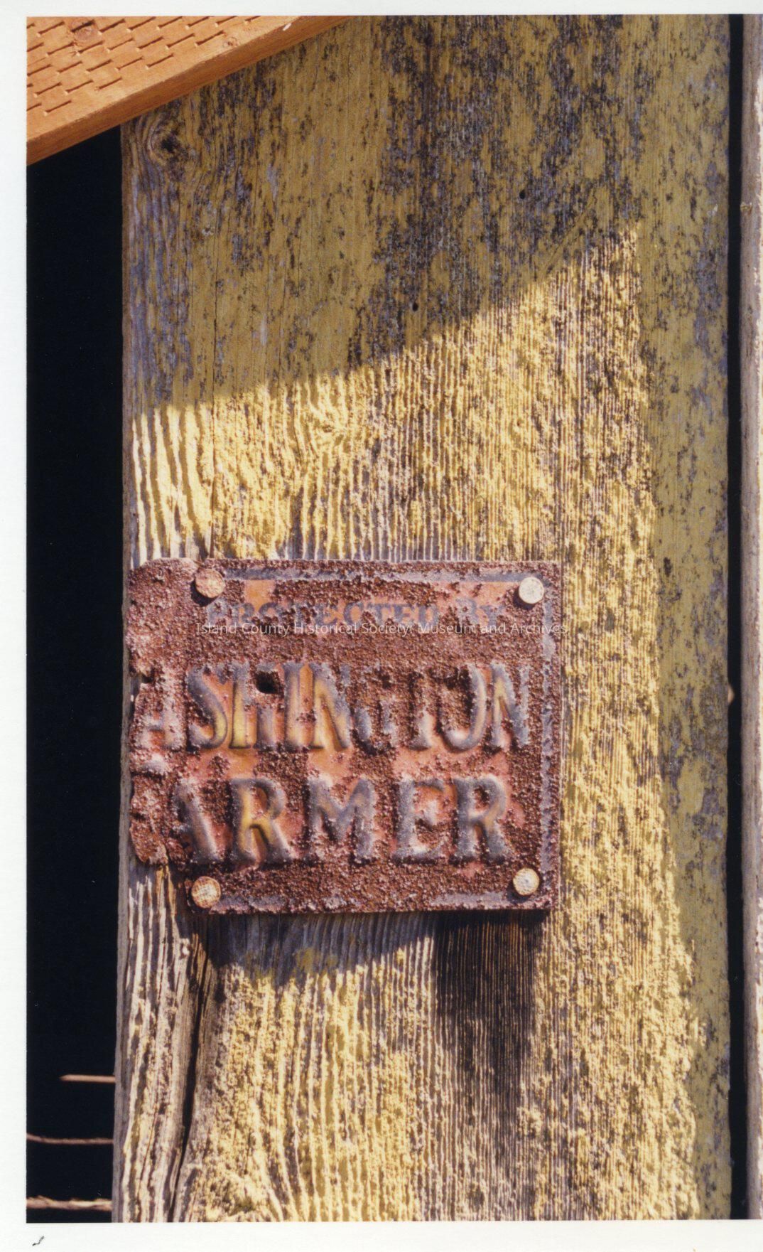 Ferry House Restoration. Exterior shot. Close-up of wooden plank of stables. Rusty partial label which seems to say: "Protected by Washington Farmer". "Protected" may be sometheing else and there may be words missing. Four rusty nails keeping it attached to the wooden plank.