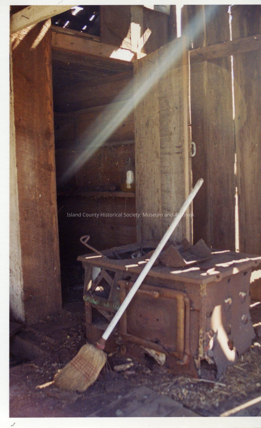 Ferry House Restoration. Interior shot. Dilapidated section. Rusted, broken metal stove with debris all around it. A broom propped up against it. Wooden planks have gaps between them. A door and little room (pantry?) off on left of picture with some shelving.