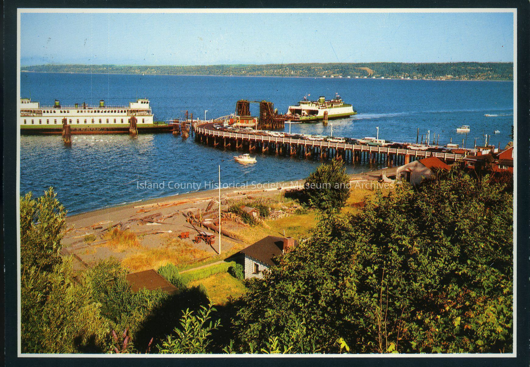 Postcard of Columbia Beach, also known as Clinton. Descriptive text on reverse of postcard reads, "At Columbia Beach, often referred to as Clinton. This is the south Port of Whidbey Island, one of Puget Sound's most popular resort areas." Photo by Newkirk.Collection