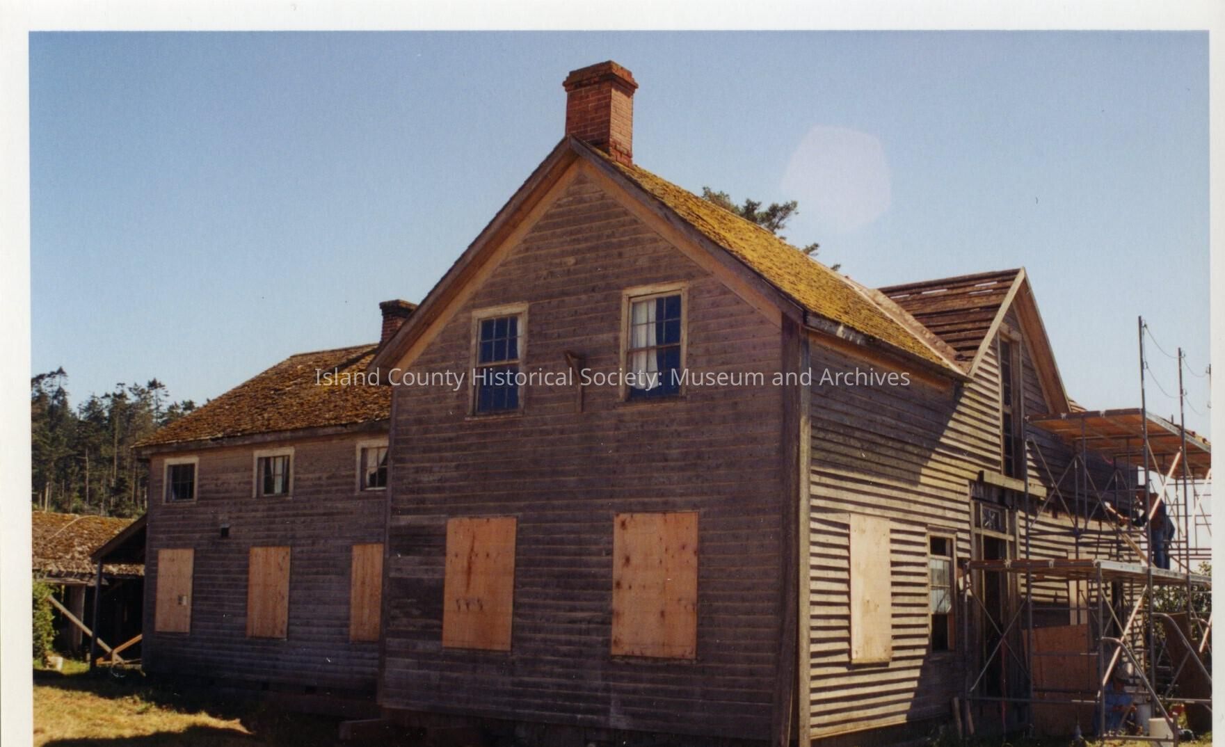 Ferry House Restoration. Exterior shot. Building front visible but mostly straight on view of left side of house. Five windows, all lower level, boarded up along this side. Scaffolding on front of building. Planks of wood and equipment on groumd. Stables visible in background on left. Two people visible on right, one under scaffolding and one on first tier of scaffolding.