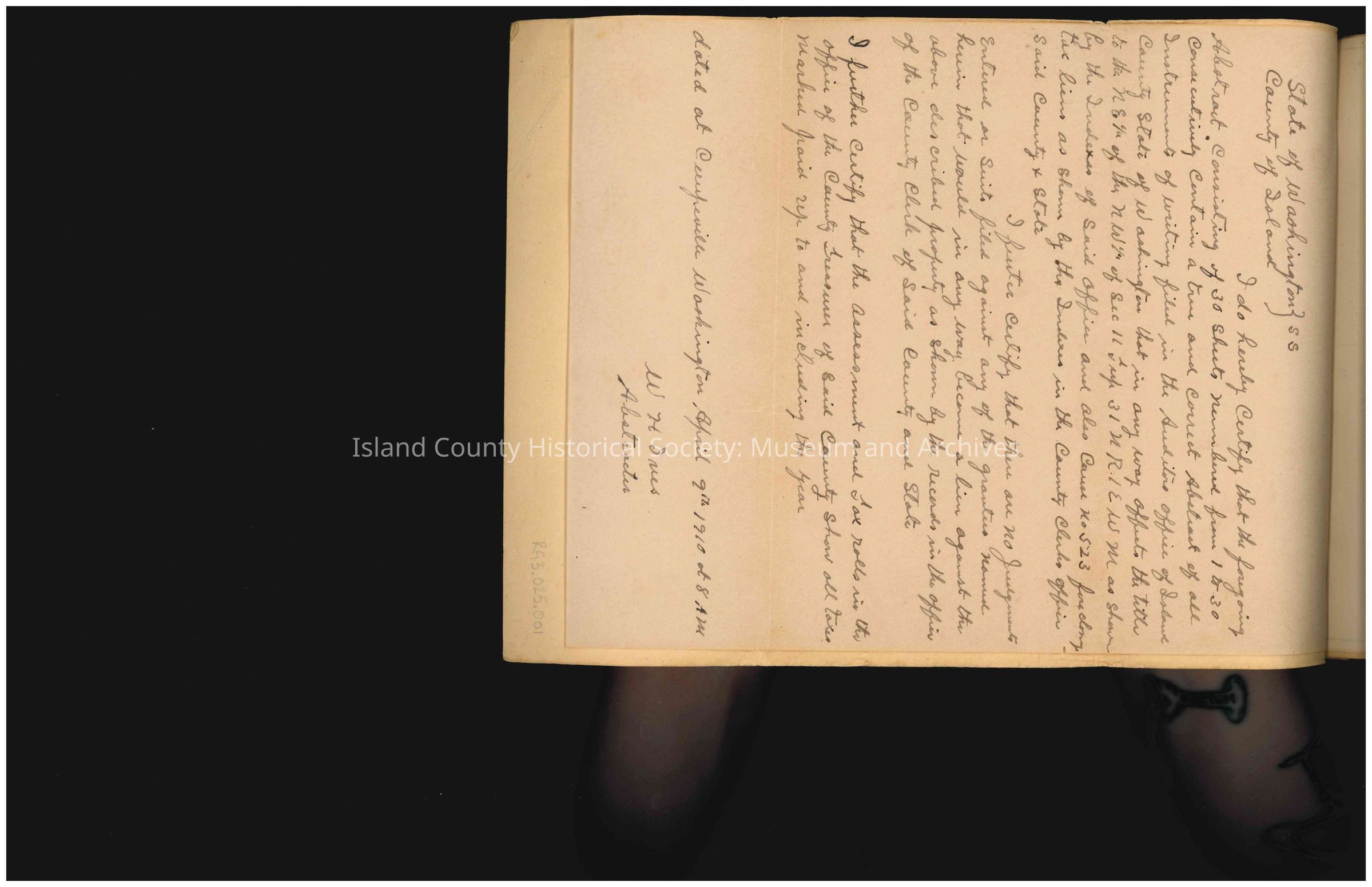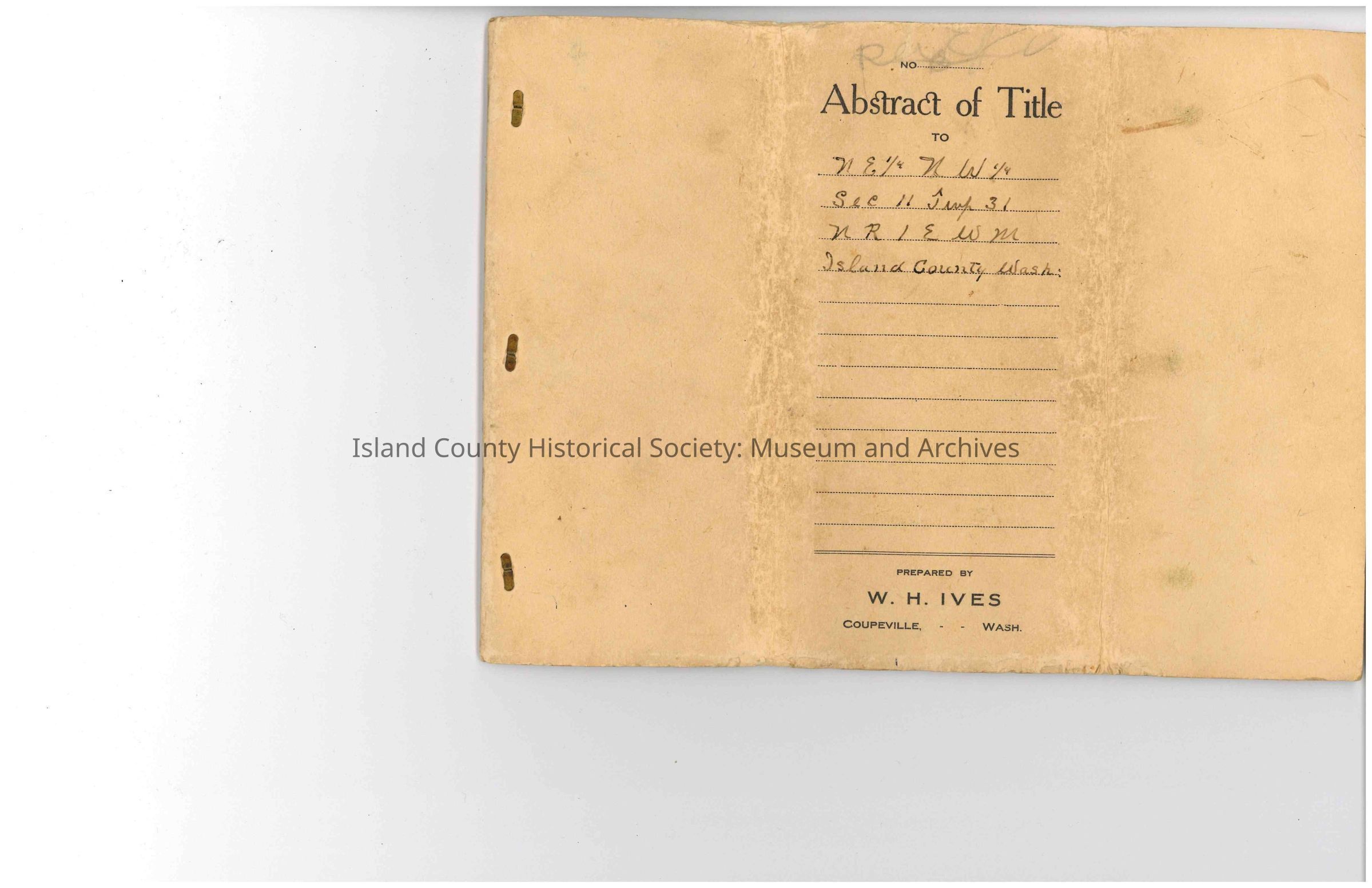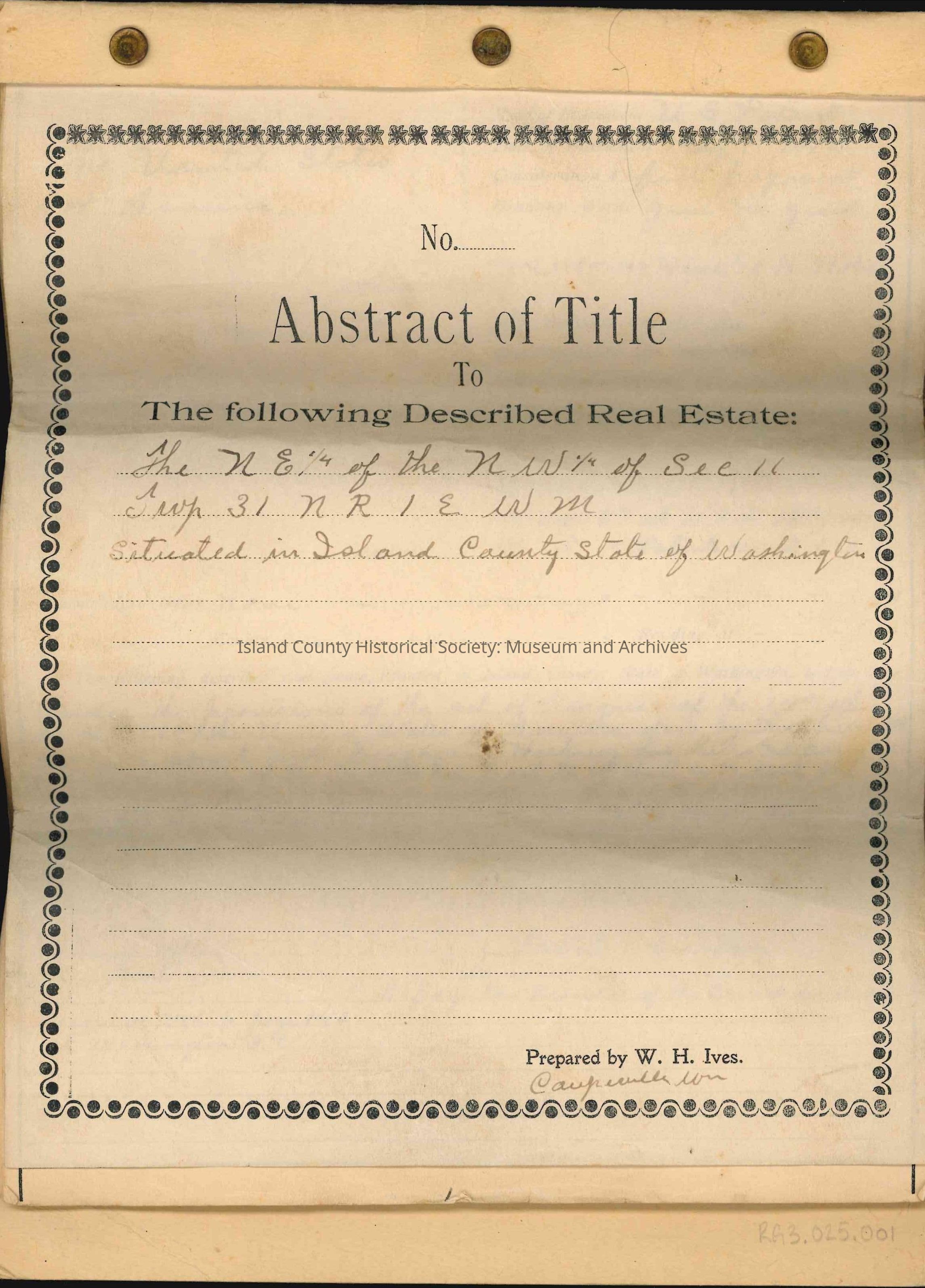 Abstract of Title for land and real estate: "The NE 1/4 of the NW 1/4 of Sec. 11 Twp 31 NR 1 E WM situated in Island County State of Washington [sic]."