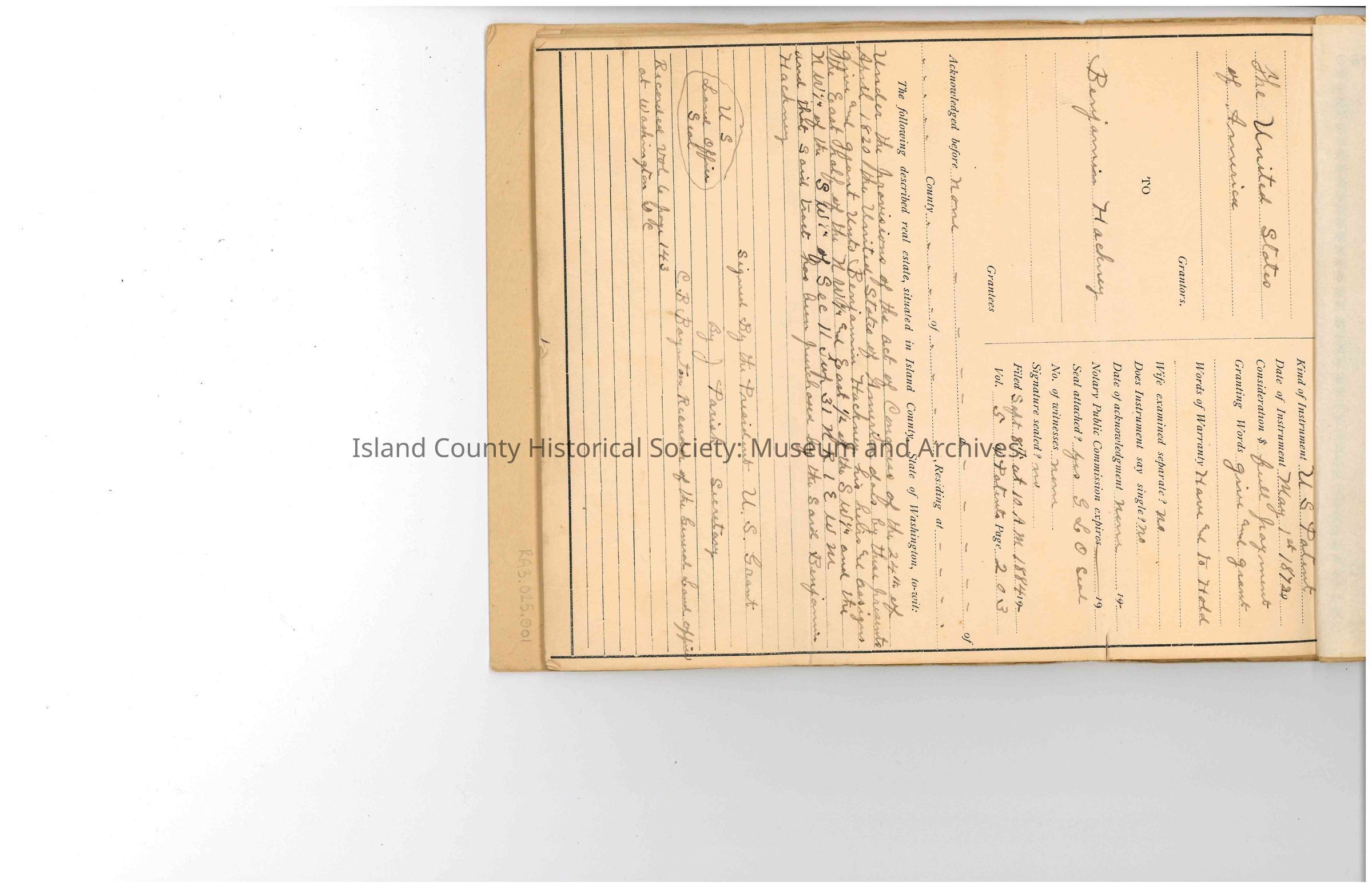 The first patent record for this portion of land is attributed to Benjamin Hackney, dated 1872.