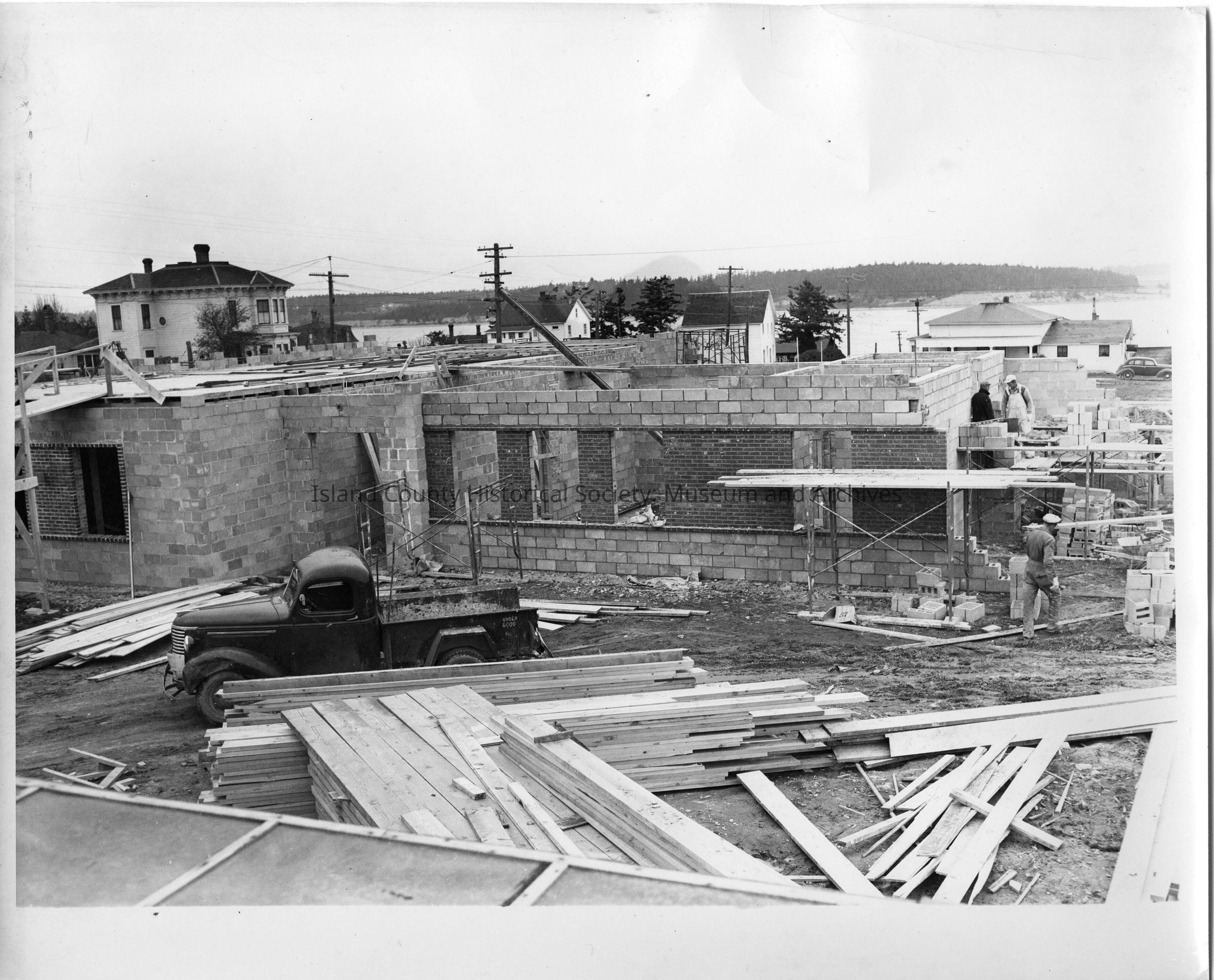 Photo depicts ground level of courthouse being built. In the foreground a 1940's pickup truck sits behind a pile of lumber. To the right are three construction workers, one working on the masonry. Several houses and the water can be seen in the background