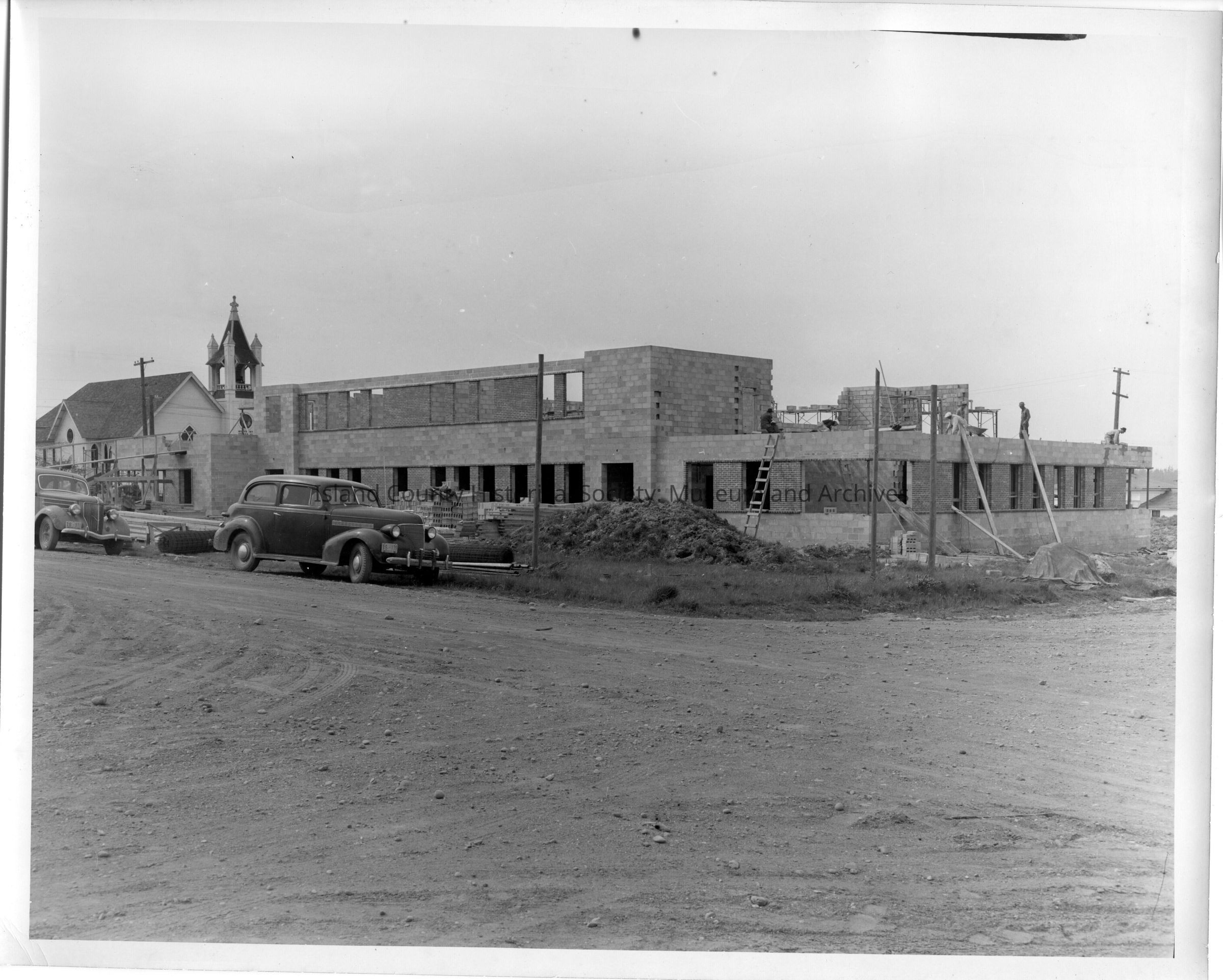 Photo depicts courthouse with second level nearly completed. Construction workers can be seen on the second level. In the foregrounds two 1940's cars are seen, behind the courthouse is a large building with a bell tower.