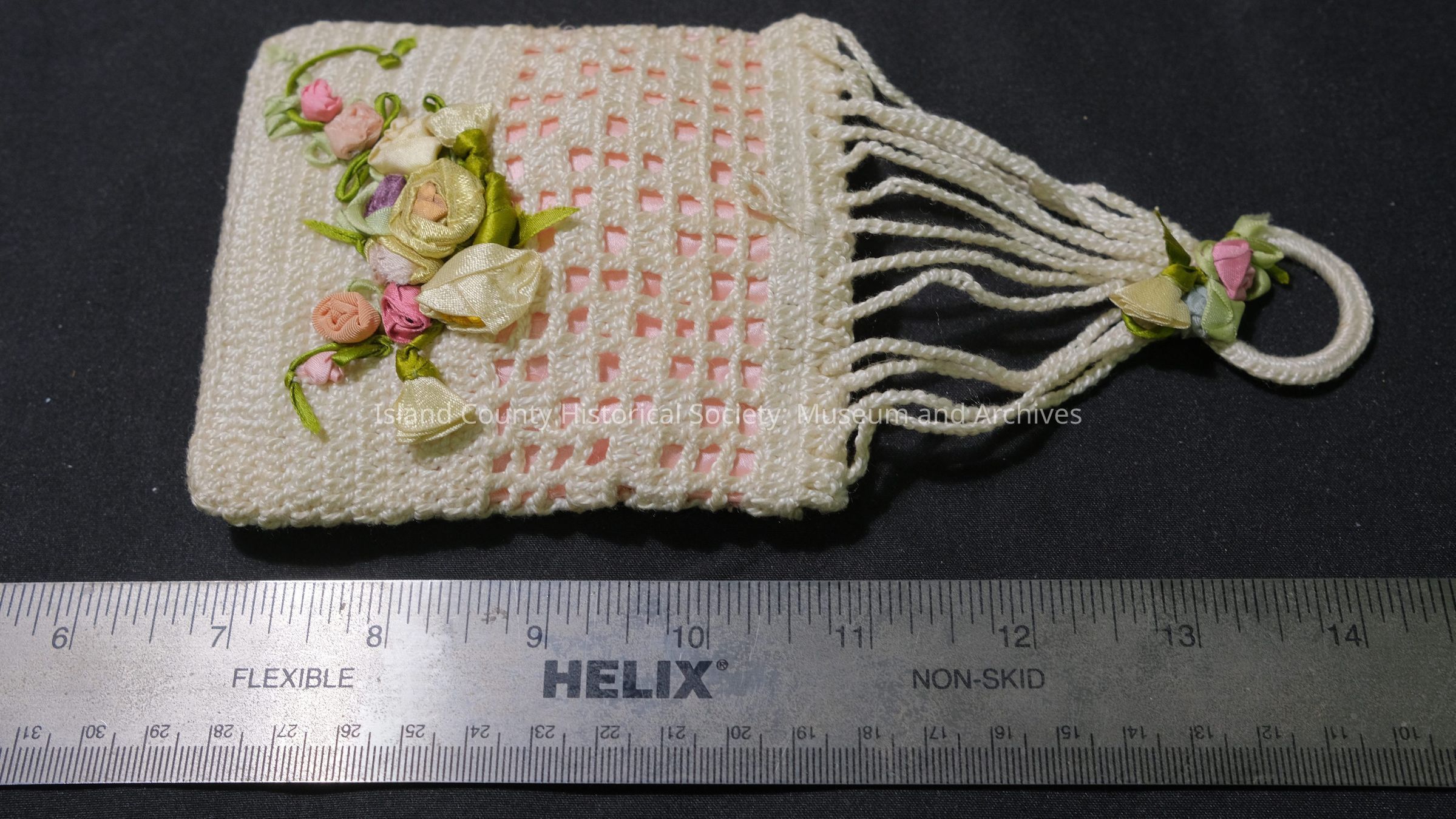 Crocheted bag with pink satin lining. From the 69-050 entry: Cream crochet purse with floral details and satin lining. Satin drawstring closure and handle.