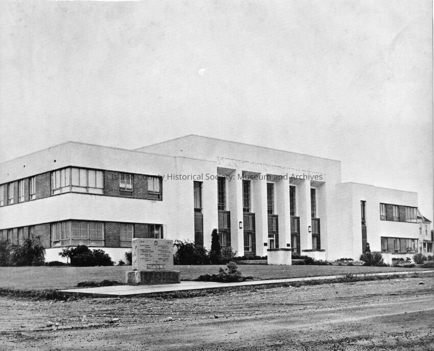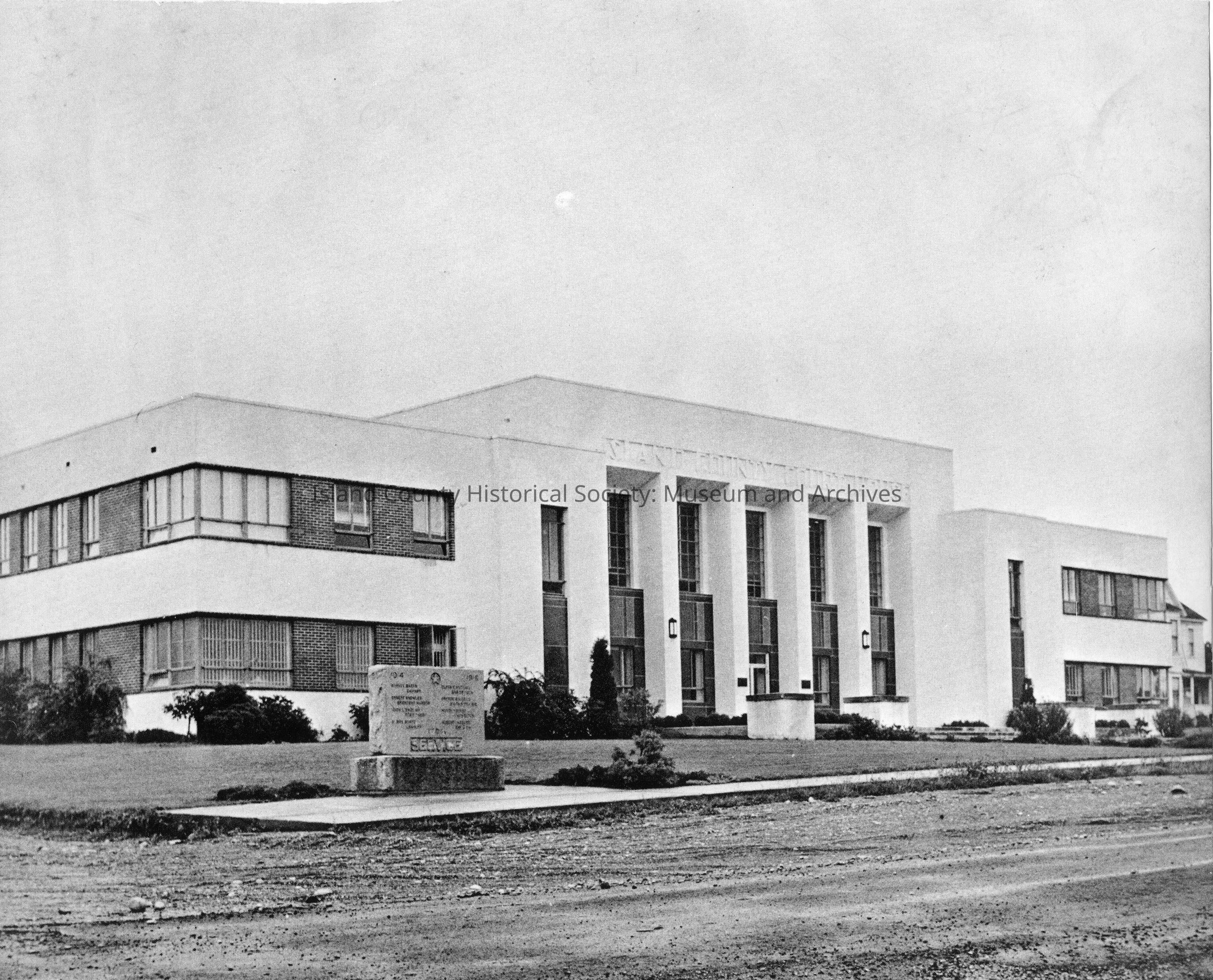 Three quarter view of courthouse finished with landscaping, finishing details such as decorative lighting and window frames. Foreground shows monument for men who have died in service. In front of the monument is a road.Collection