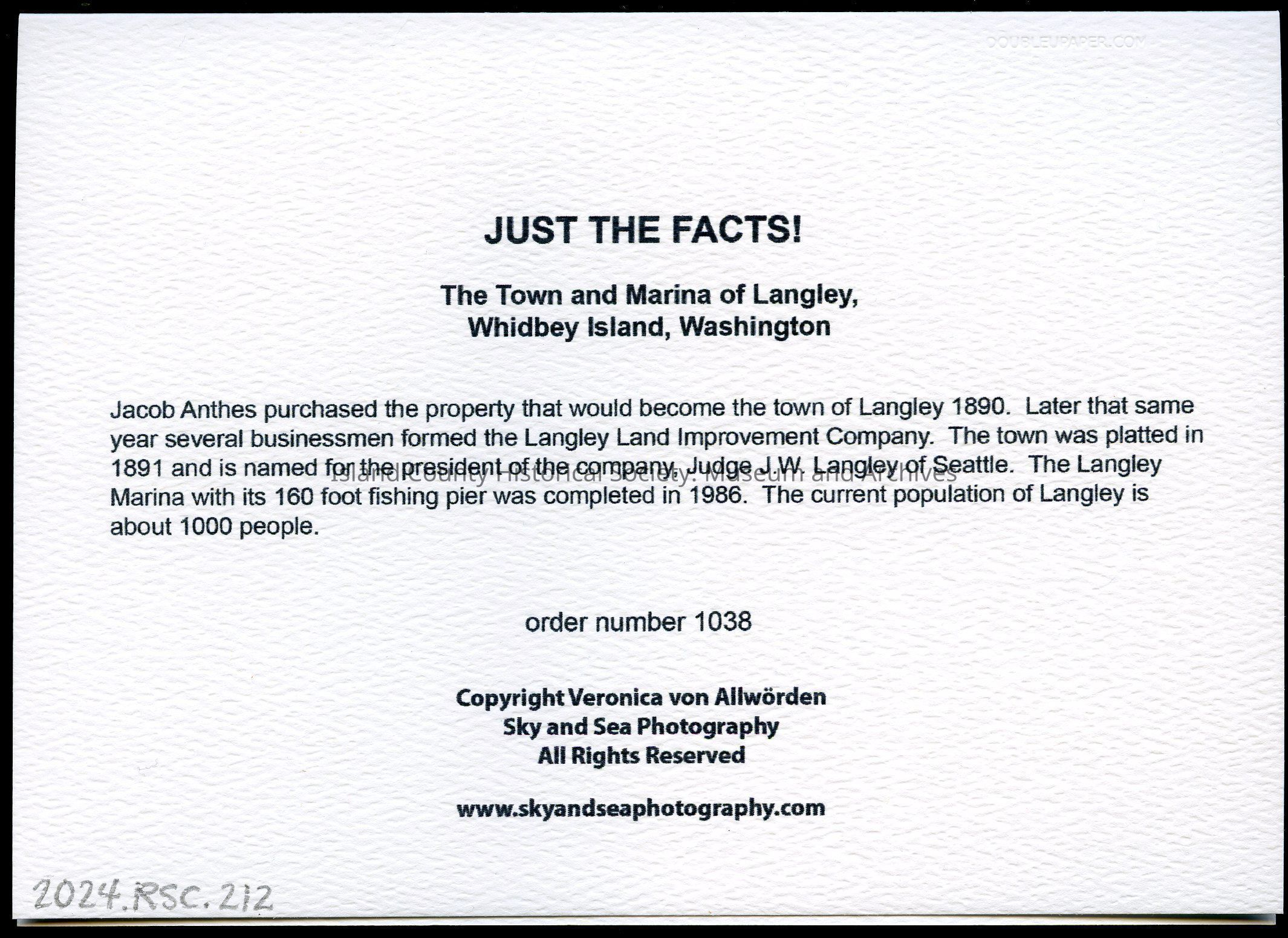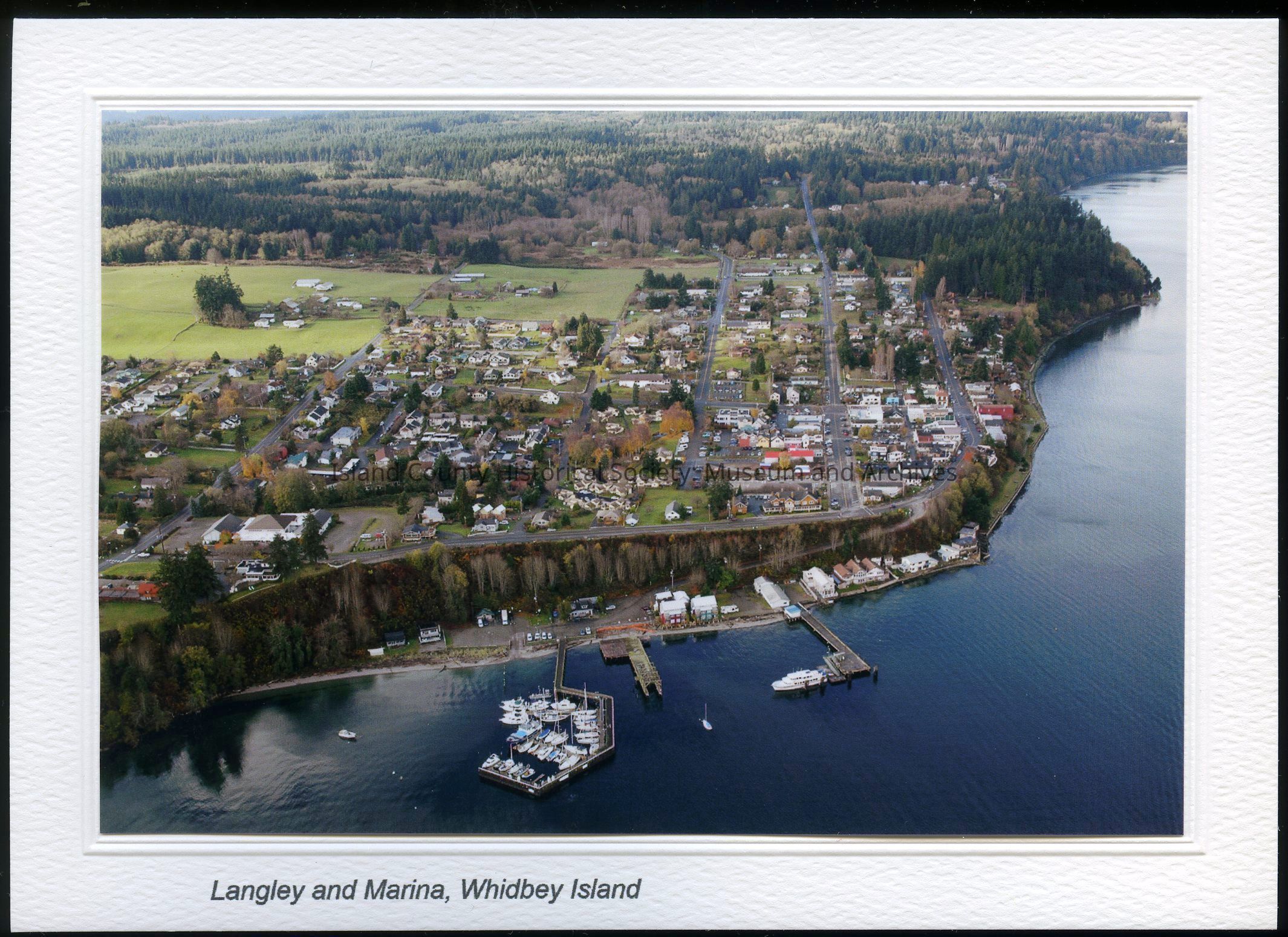 Card with a photograph of Langley and marina, Whidbey Island. The reverse of the card contains information about the town of Langley's founding. Photo by Veronica von Allwörden, Sky and Sea Photography.Collection