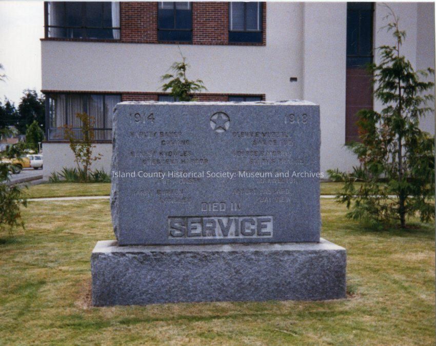 Close up of monument in front of Island County Courthouse. Monument has two years at the top 1914 and 1912, two lists of names, at the bottom the monument reads "Died in Service."
