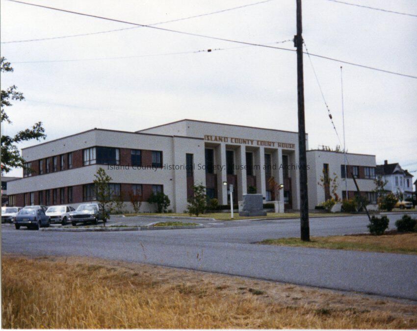 Color photo. Three quarter view of Island County Court House. Court house construction is finished and the building is in use, at the left cars are seen parked in the lot.Collection
