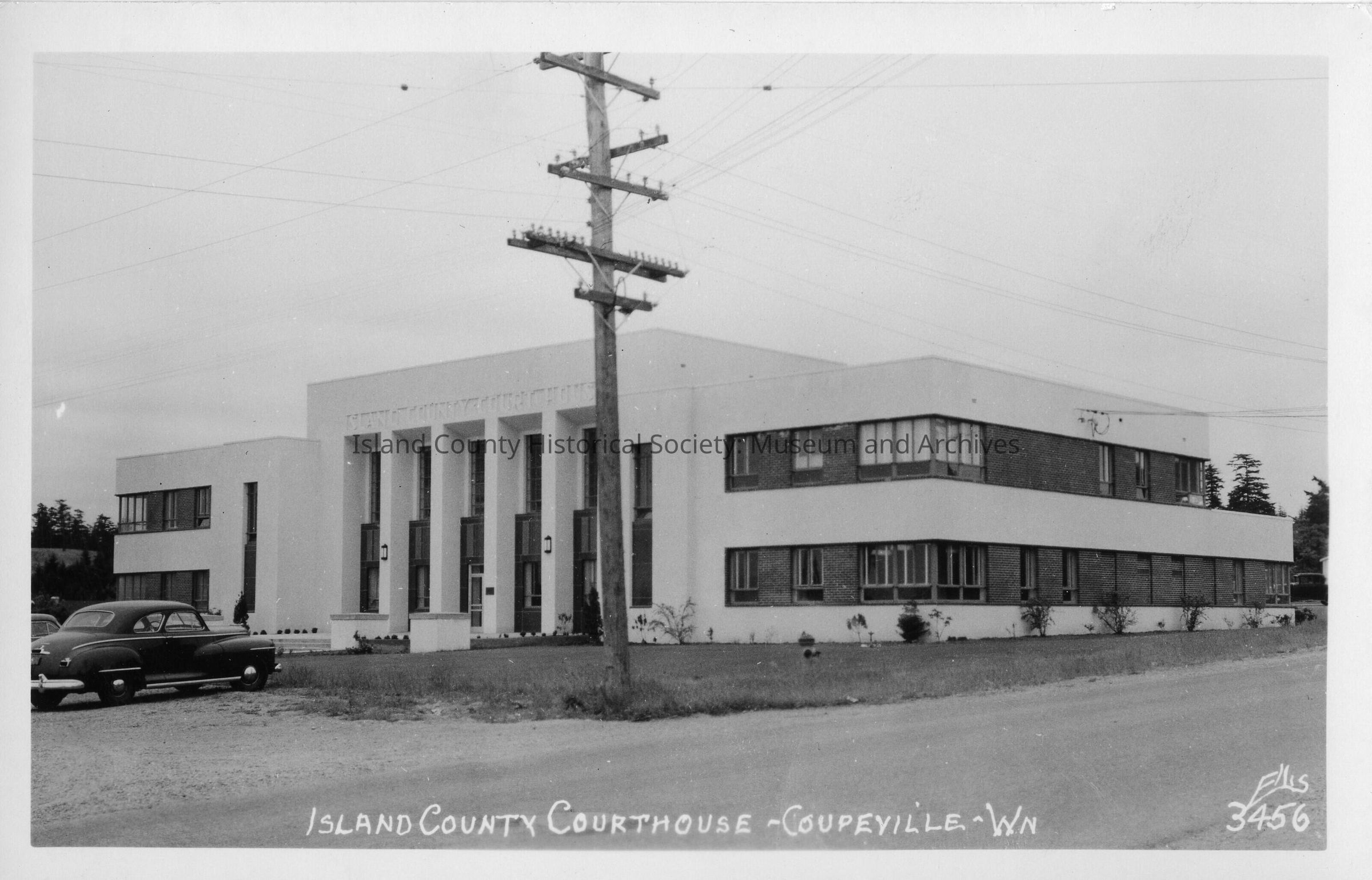 Postcard showing three quarter view of Island County Court House, construction finished. A 1940's car is parked in front. The postcard is printed by Ellis with the number 3456.