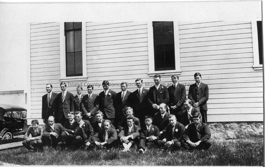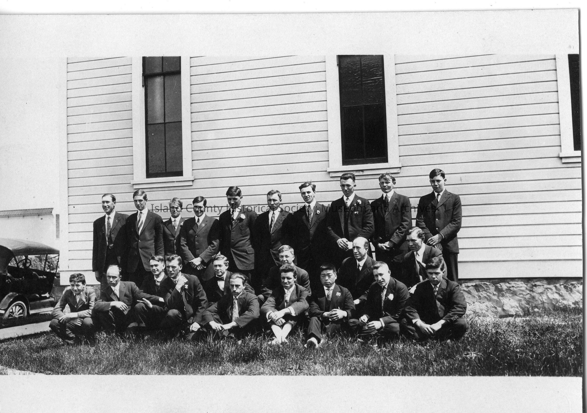 All boys in the picture are wearing uniforms consisting of a suit, tie and dress pants. To the left an old 1900's style car can be seen.