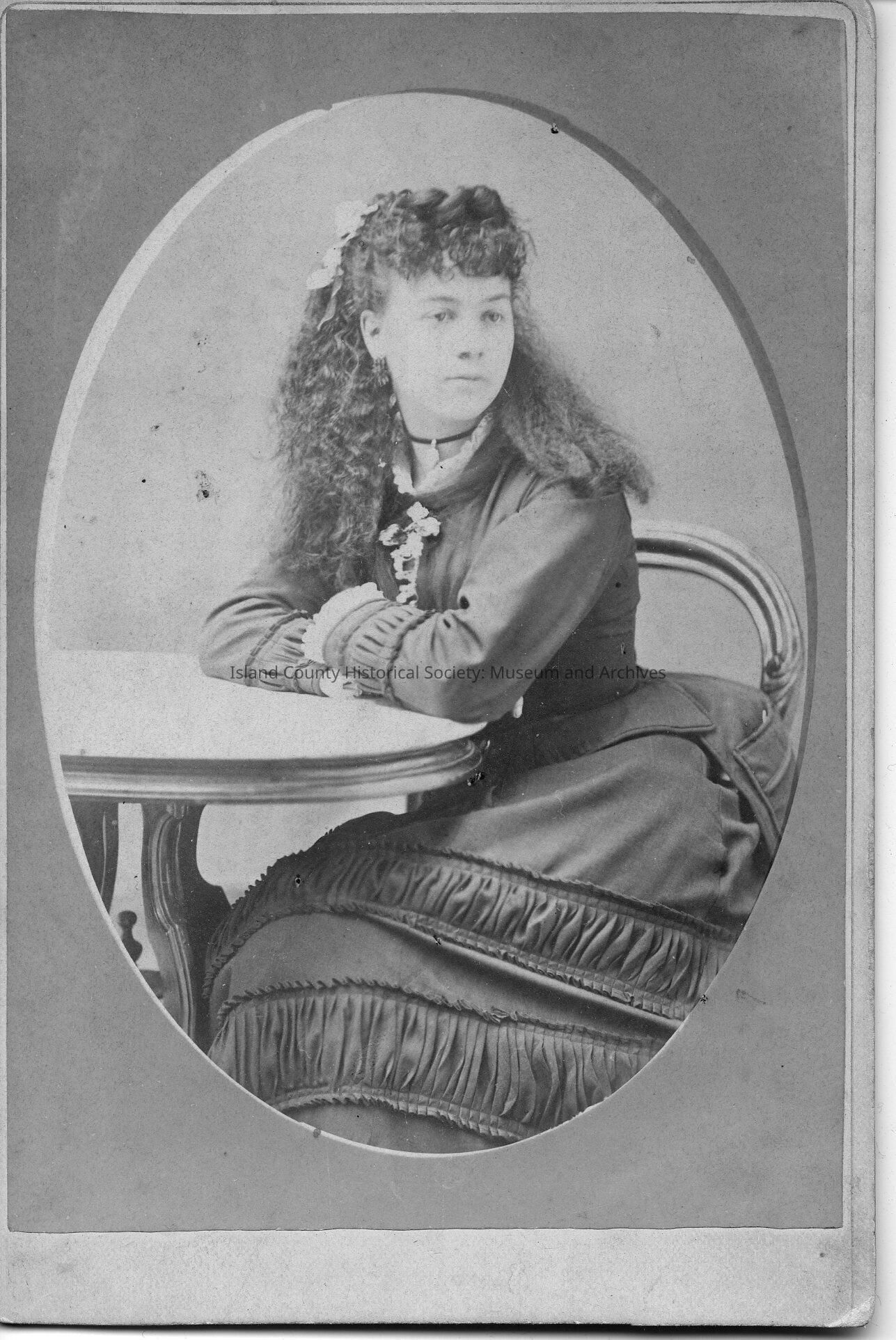A black and white photo of a woman, sitting at a table, with an oval frame. Handwritten on the back is "Martha S. Power." "Matty"Made/Created