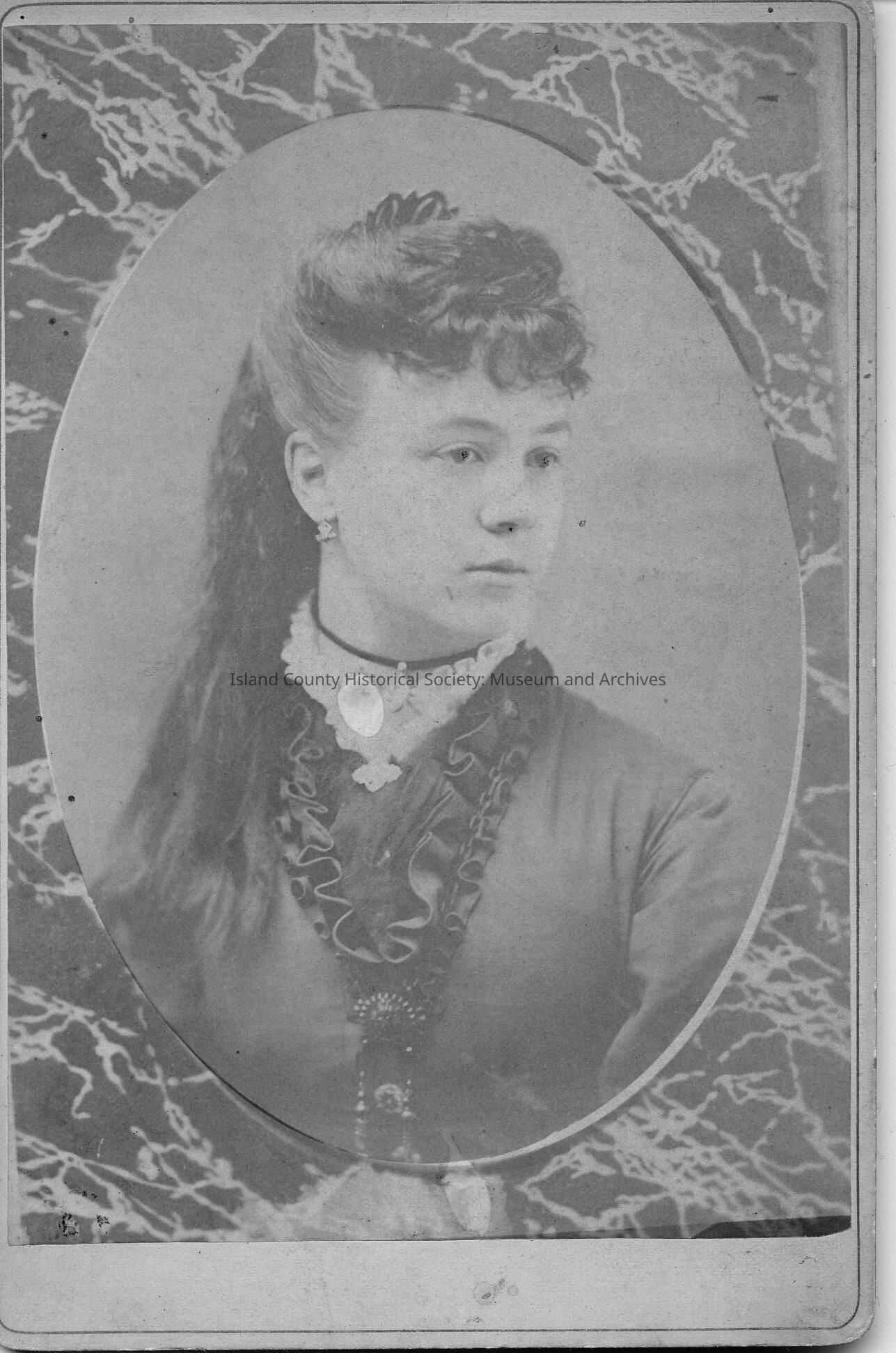A black and white photo of a woman, with an oval frame. Handwritten on the back is "Martha S. Power. " "Matty"Made/Created