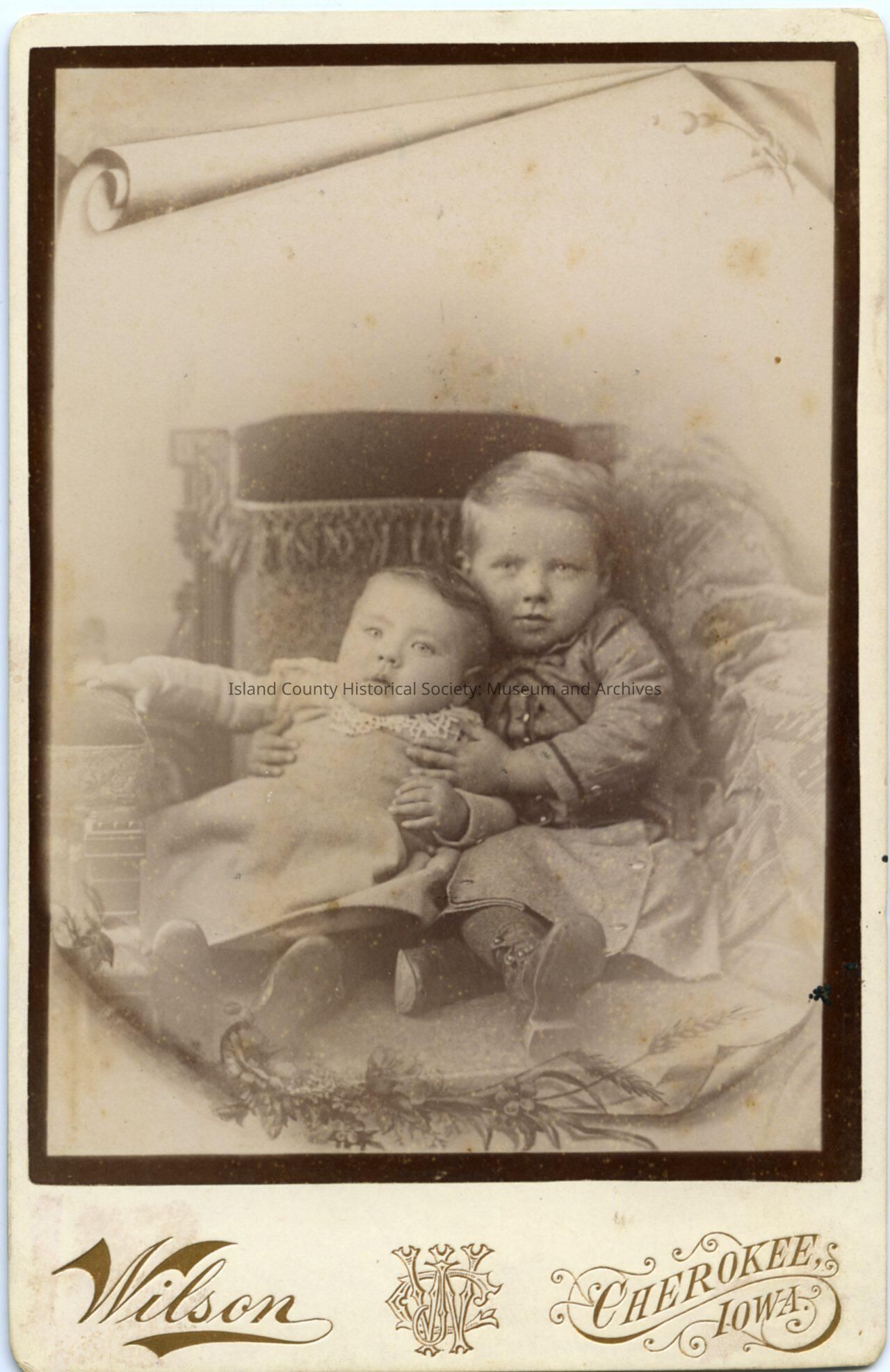 Photo of two boys, the older holding the younger, leaning back against a rug-covered chair. The younger is wearing a dress with lace collar and shoes, the older a jacket and skirt with buttons, and lace-up boots. Studio portrait. Written on the back: Ray and Alvin.