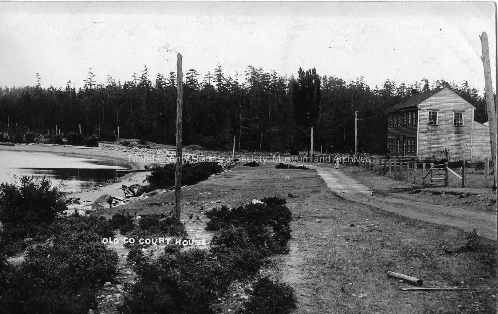 This photograph depicts the original courthouse in Coveland exact date not known. The courthouse is sitting on a pasture next to the water. A dirt road runs alongside the courthouse. This photo is printed as a postcard by the CYKO company between 1904-1920's.