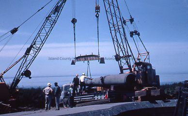 Photograph of a cannon being lowered into position at a naval fort, possibly Fort Casey.