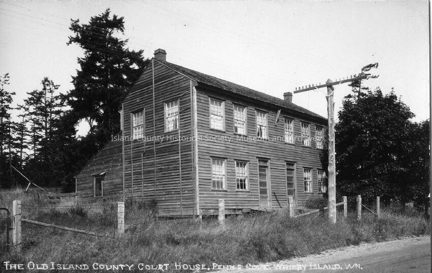 Close up photo of original courthouse in Coveland, exact date unknown. Photo is taken at an angle and two sides can be seen with a grassy field surrounding it. Bottom of the photo reads: The Old Island Court House, Penn Cove Whidbey Is, WN