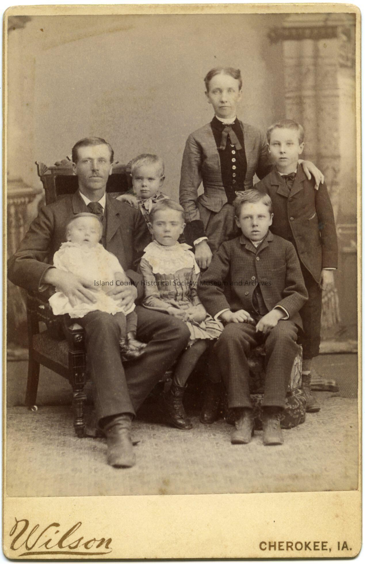Photo of a family group of a man (seated), woman (standing), three boys and girl and a baby. The girl is seated to her father's left and is wearing a dress, wide lacy collar, stockings and high boots. The oldest boy is standing to his mother's left with her arm around his shoulder. The younger boys are seated on a stool or the arm of the chair. The mother is wearing a tow-tone dress/skirt with buttons down the center and a bow at the neck. The father is wearing a suit.The baby is wearing a dress with lace collar and seated on the father's right knee. Studio portrait.