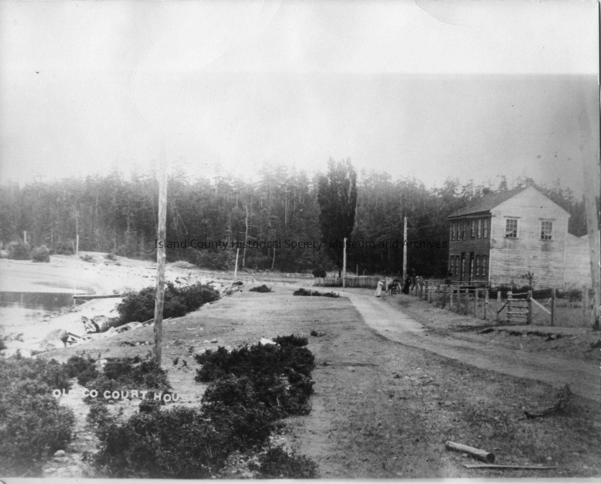 This photograph depicts the original courthouse in Coveland, exact date unknown. The courthouse sits on a pasture next to the water with a dirt road running alongside the building. Front of photo reads: Old Co. Courthouse.Collection