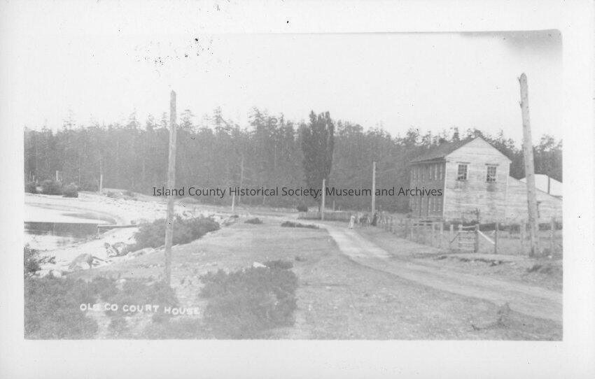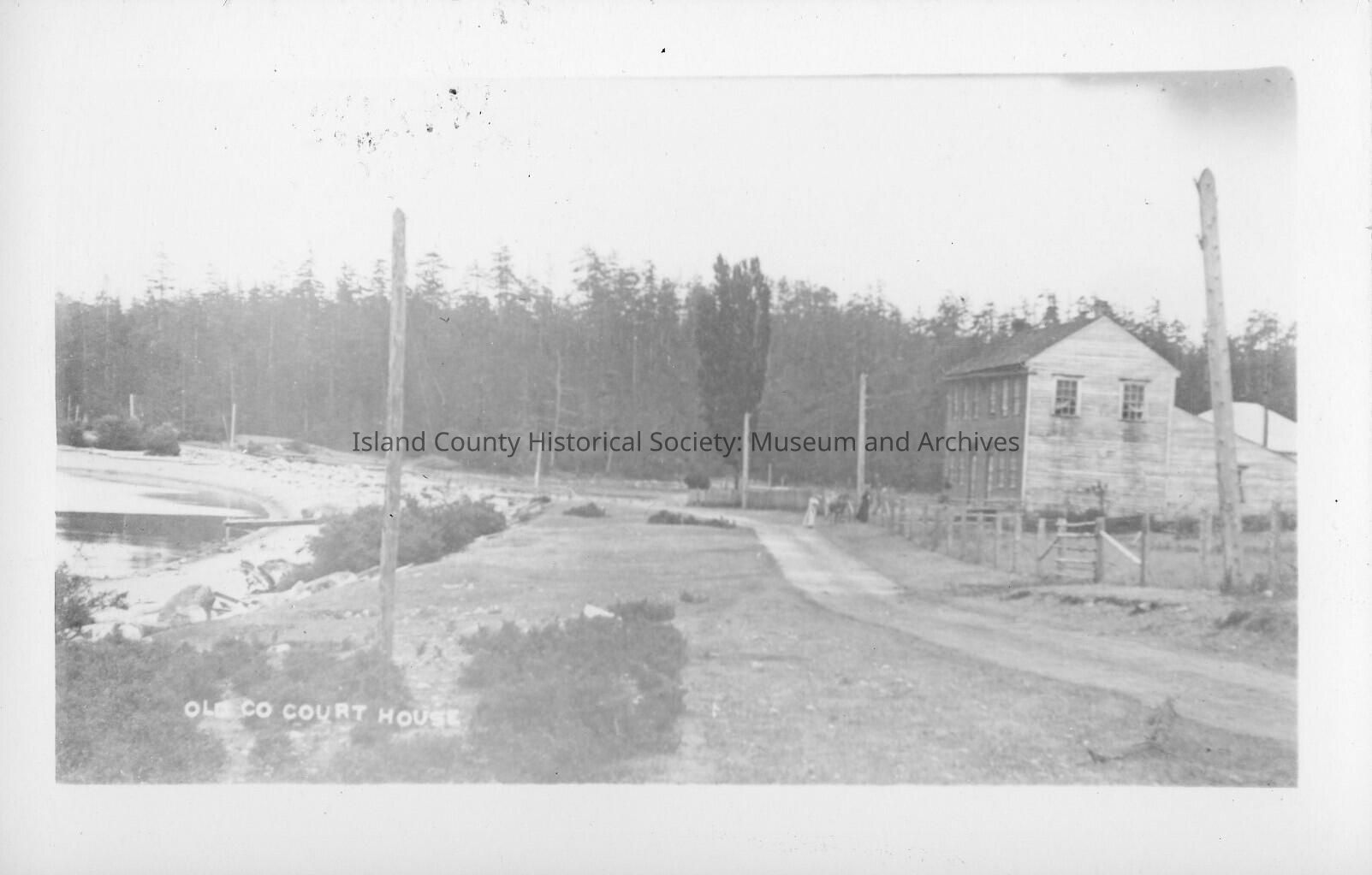 This photograph depicts the original courthouse,in Coveland, exact date unknown. The courthouse sits on a pasture next to the water. Photo is printed as a postcard by Kodak as early as 1950 and as late as present day.