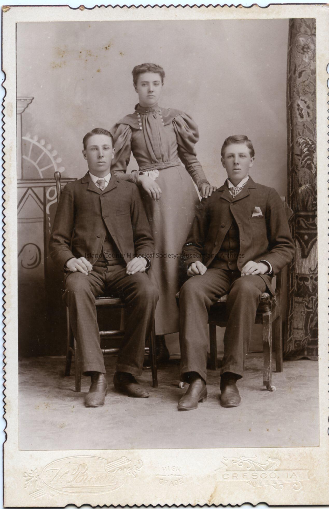 Photo of a young woman standing between two young men who are seated. She is wearing a dress, gloves or lace tucked at her waist, ruffled center to the top, mutton sleeves. The young men are weraing suits and high shoes/boots. Studio portrait.