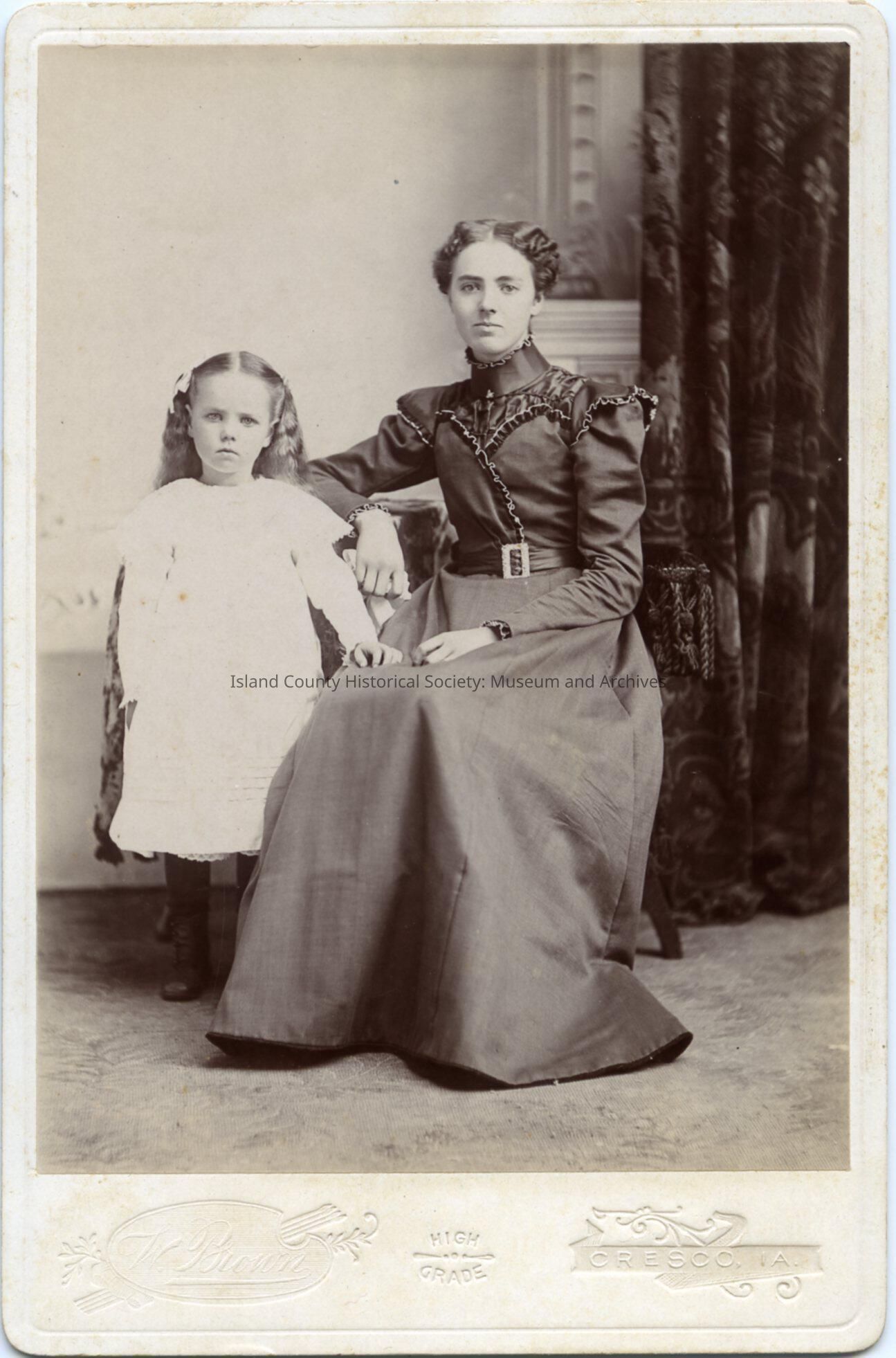 Photo of a young woman seated with a girl standing on her right. The woman is wearing a dress with a belt, high collar, mutton sleeves. The girl is weraing a knee-length dress, stockings and shoes, bows in her hair. Studio portrait. Written on the back: Lulu and Mae