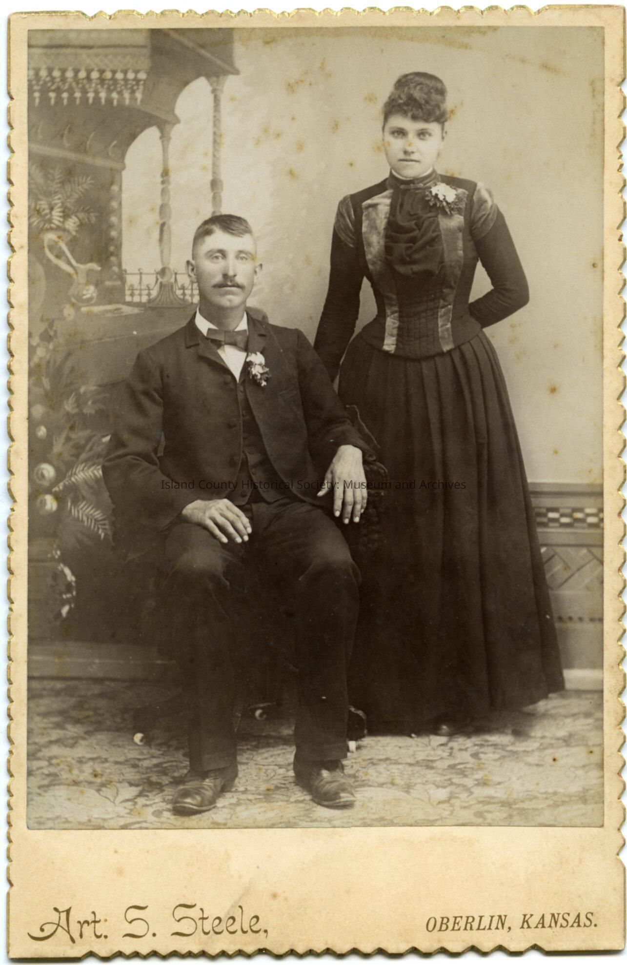 Photo of a young man with a mustache seated in a chair with a woman standing at his left. He is wearing a suit with a ribbon tie, and corsage. She is wearing a jacket/top with a skirt. THe top has bands of satin and a corsage. Written on the back: Emma Morris