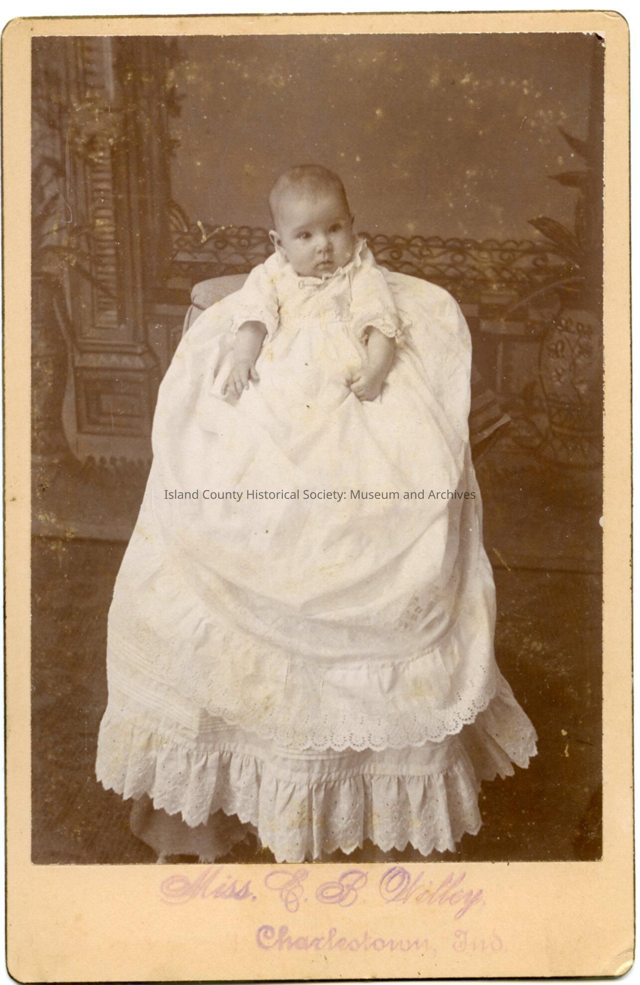 Photo of a baby seated in a chair, wearing a long and lacy christening gown. The caption is: Miss E. B. Willey. Charlestown, Ind.