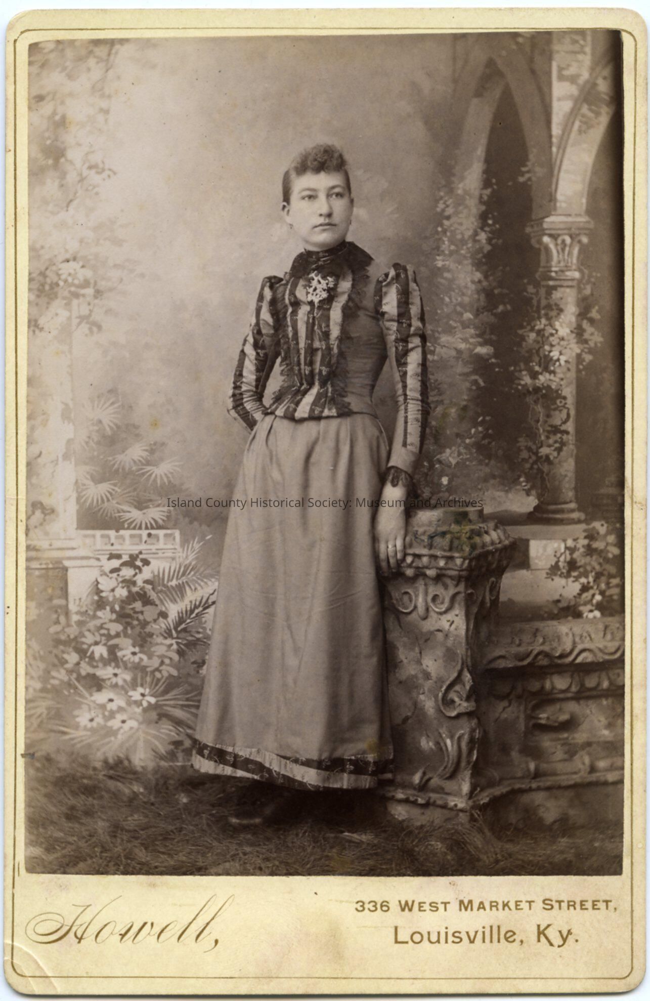 Photo of a young woman standing and maybe leaning on the studio props. She is wearing a top and skirt. The skirt has a diagonal striped ruffle at the hem. The bodice/jacket has matching but vertical stripes with a plain background. Sleeves slightly puffed at the shoulders. Lacy collar and cuffs.