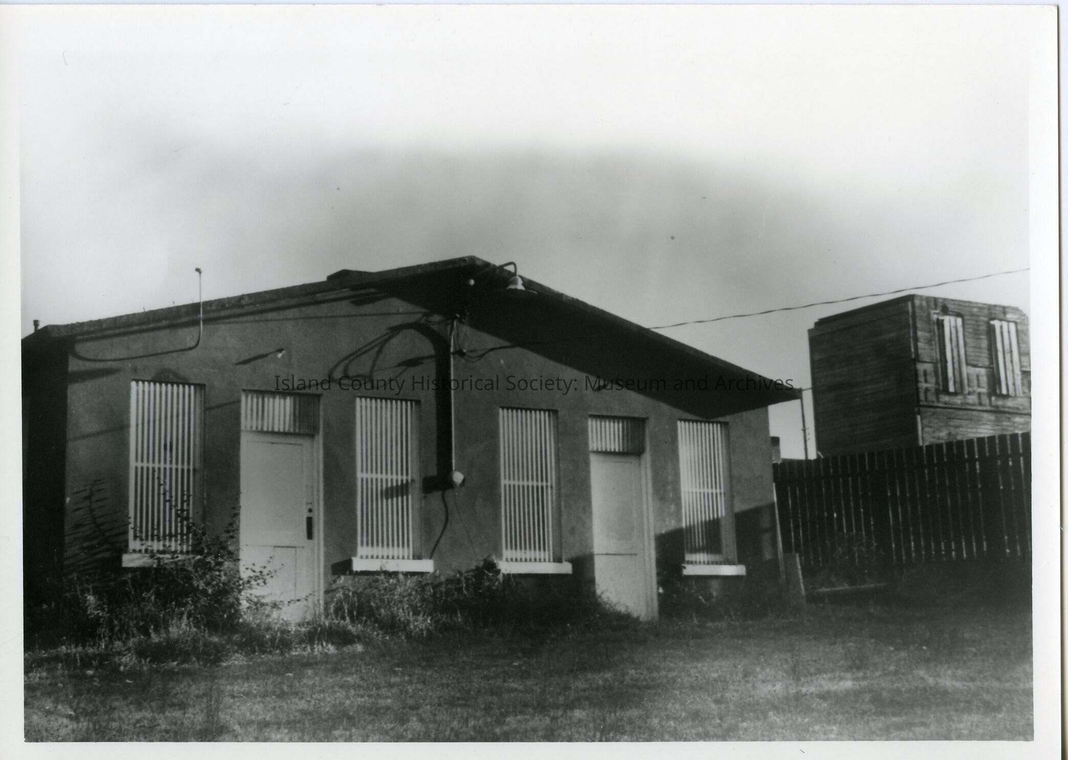 This photograph depicts the Island County Jail, date unknown. Photo shows a small cement building with pitched roof and two doors, all windows have bars on them. Visible on the far right hand side is the vault to the original Lovejoy courthouse in Coupeville.Collection