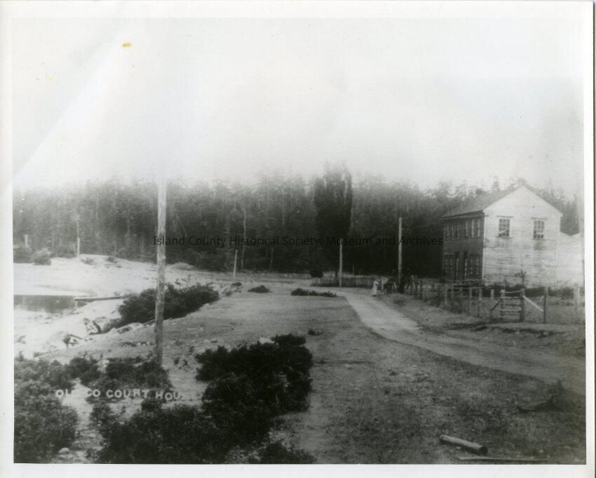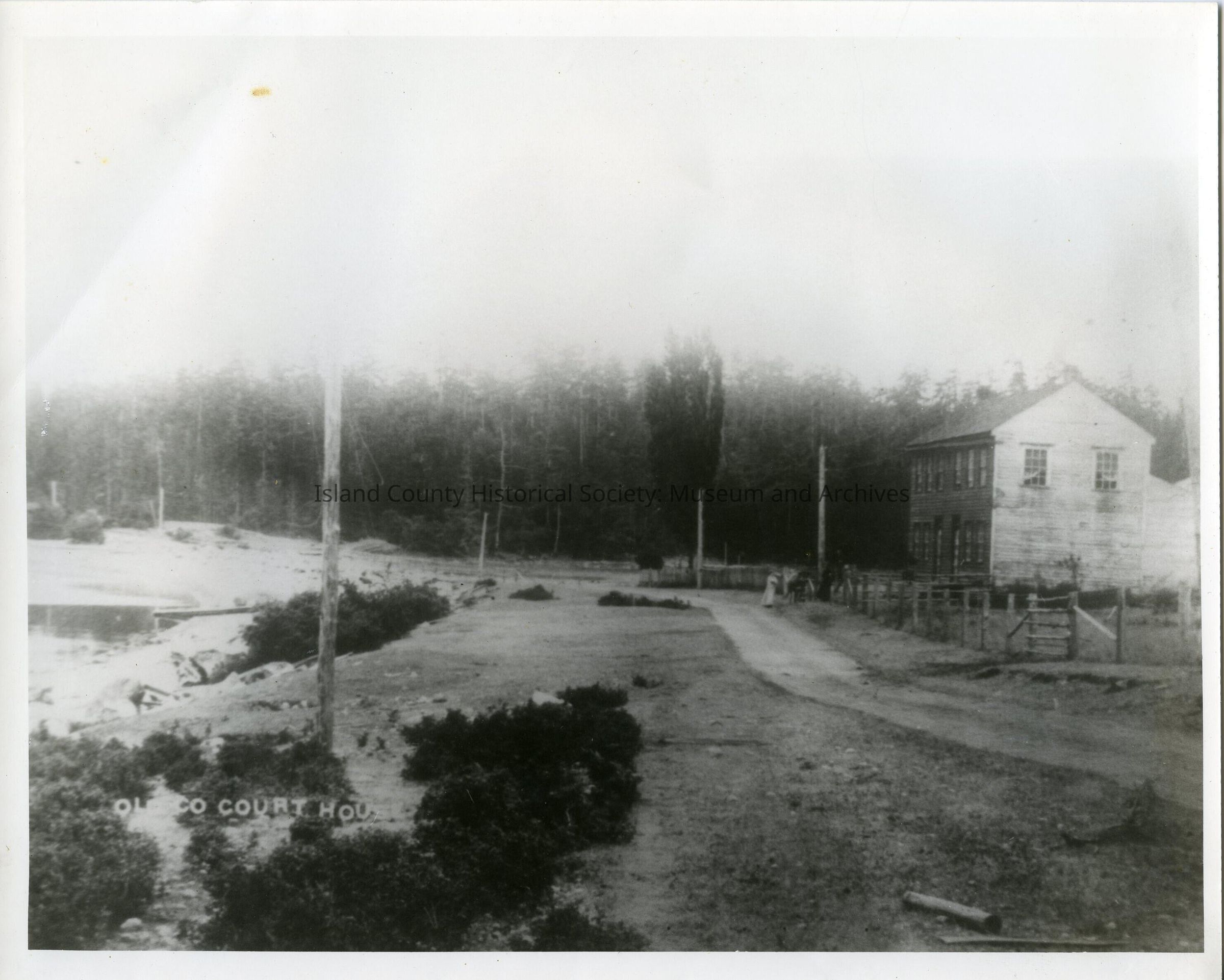 This photograph depicts the original courthouse, in Coveland exact date unknown. The courthouse sits on a pasture next to the water. In this photo a few people can be seen in front of the courthouse next to the road.