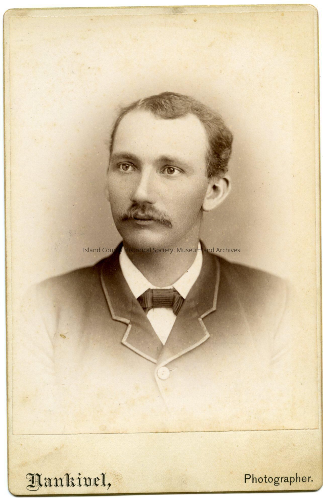 Photo of a man with a mustache. He is wearing a suit with grosgrain bow tie. The photo is from mid-arm upwards.