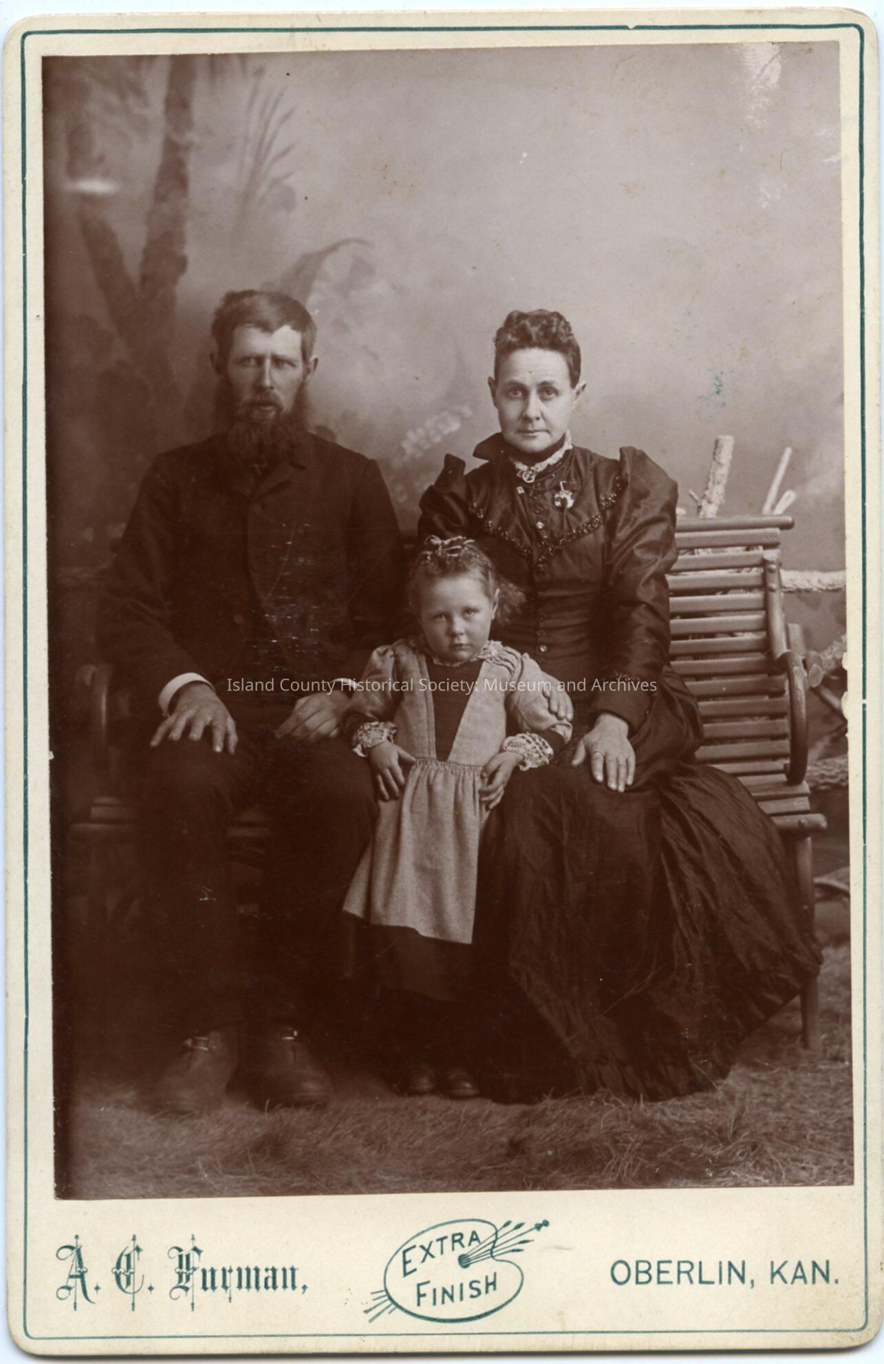 Photo of a family group. The adults are seated on a bench wtih a girl standing between them. The man is wearing a suit, clasped boots, has a mustache and long beard. The woman is wearing a dress with puffed sleeves, beading a ruffle at the hem, lave around the collar. The girl is wearing a knee-length dress with lace-cuffed sleeves and a bow in her hair.