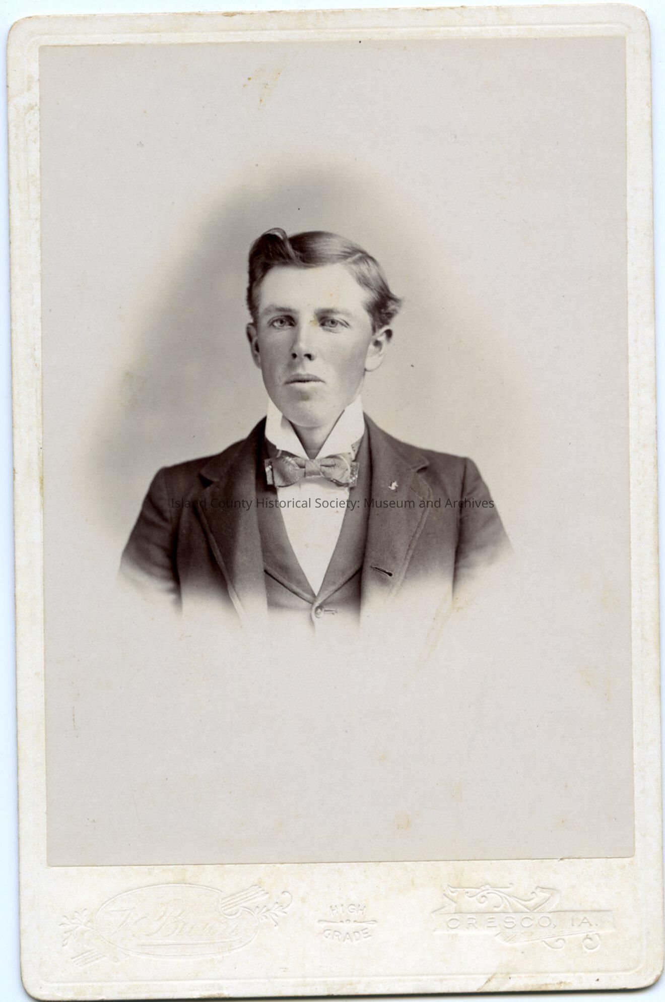 Photo of a young man from mid-arm upwards. He is wearing a suit with a flared shirt collar, bow tie. His hair has a distinct curl on his right side. Written on the back: From your nephew, Geo. Edward Morris, Clearwater, Minn.