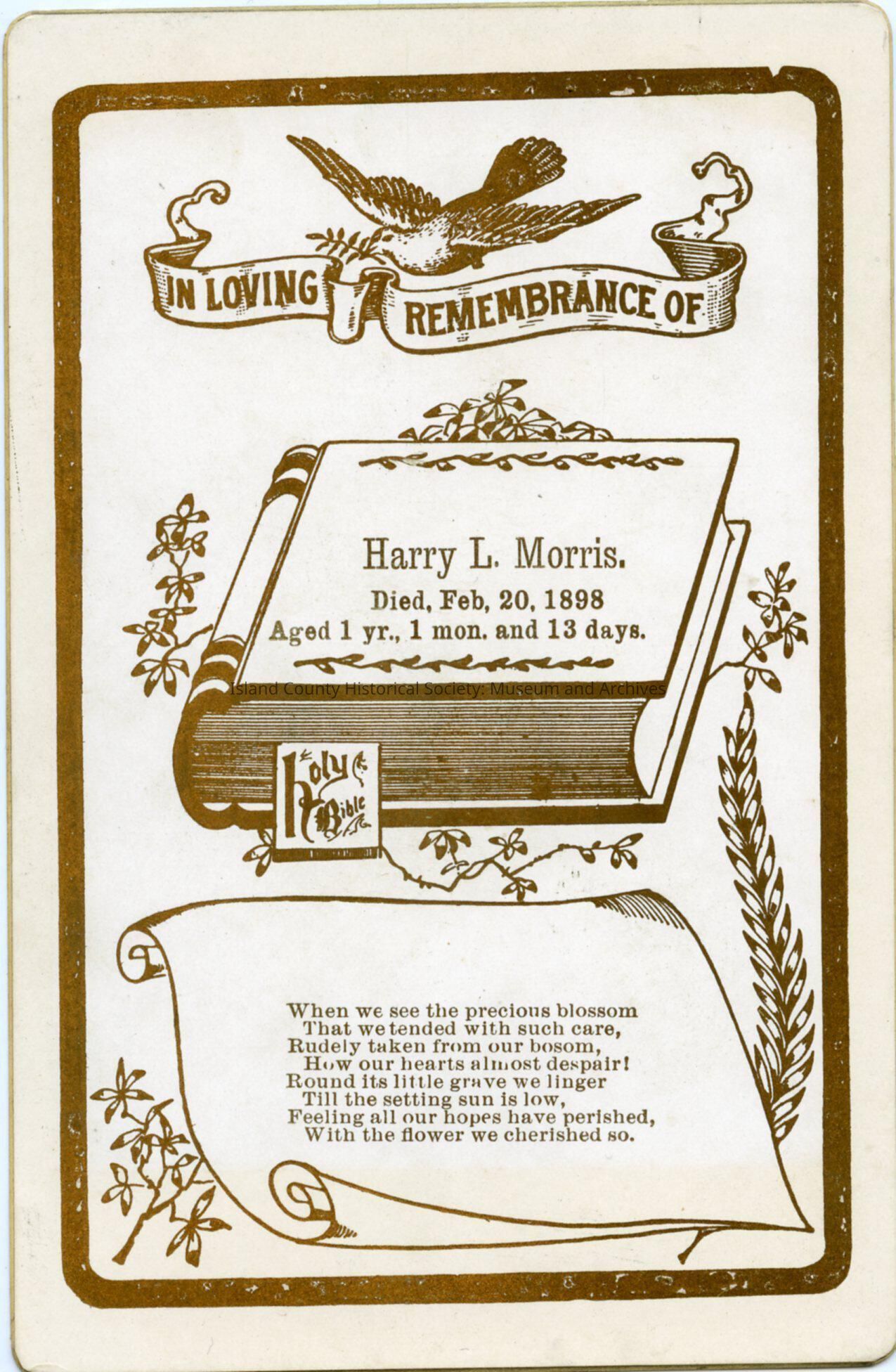 A remembrance card for Harry L. Morris, Died Feb 20, 1898, aged 1 year, 1 month and 13 days.